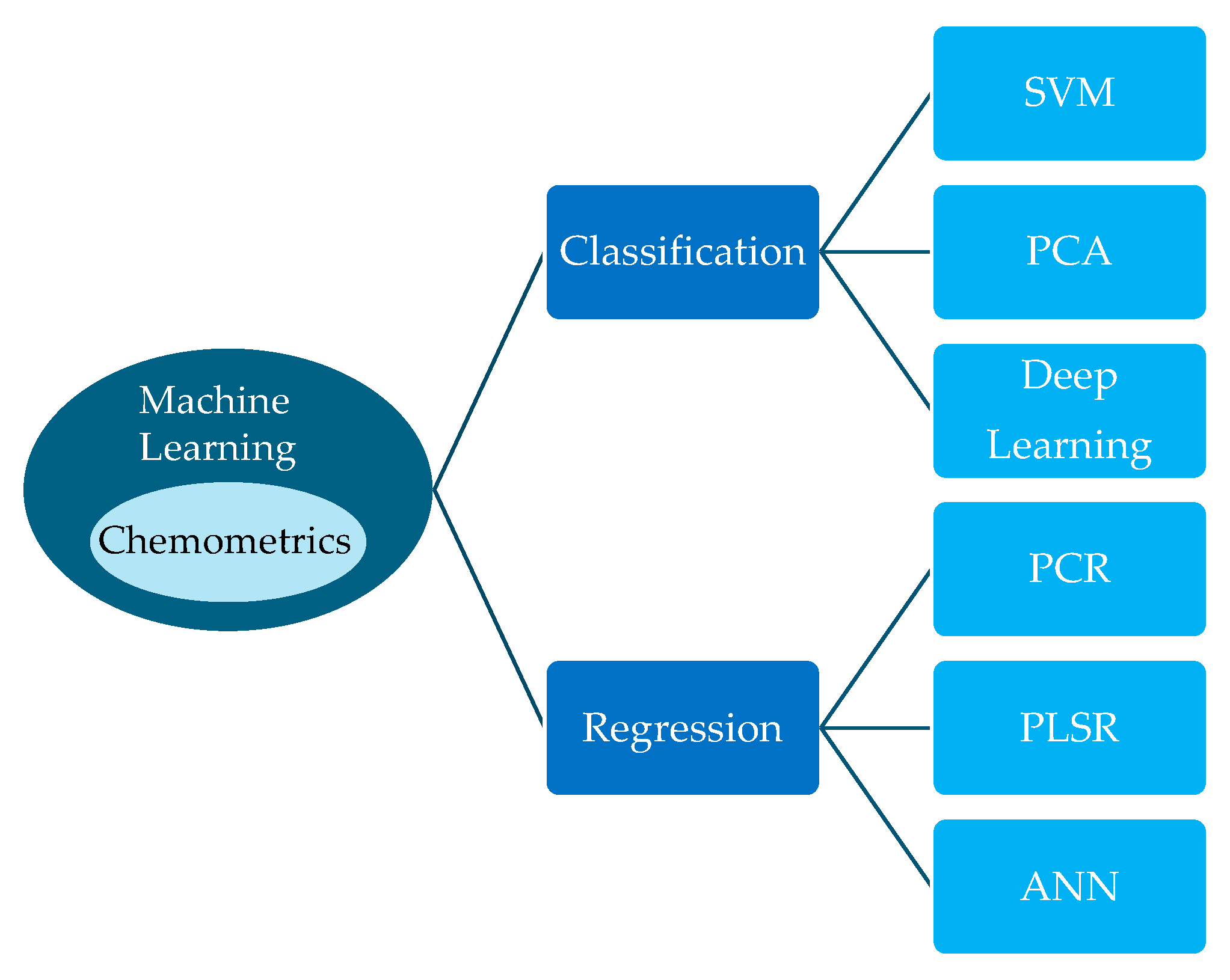 The fourth major trend is an increasing reliance on chemometrics and machine learning for interpreting complex vibrational spectra. As portable instruments generate larger and more varied datasets, robust modelling strategies are essential for reliable decision-making. This section reviews classical chemometric tools and modern machine learning approaches, highlighting their respective strengths and limitations, as well as their suitability for real-time applications. This section provides an overview of classical chemometric tools and modern machine learning approaches. It highlights the strengths and limitations of each approach and considers their suitability for real-time applications.