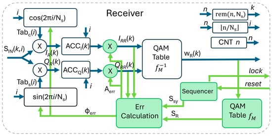 The receiver, depicted in Figure 3, is more complex than the transmitter. The blocks in green are related to the synchronization: they will be described later. In this subsection, we assume the receiver is locked: and .