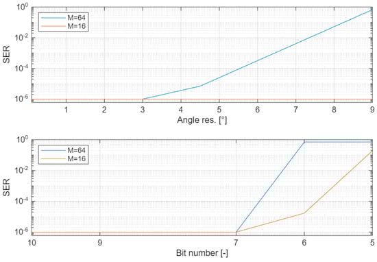 Here, is the number of symbols received with errors, and is the number of transmitter symbols for 1 packet (). The SER values measured with (17) were confirmed on three data packets, which, as shown in [33], grants a confidence level of 95%.