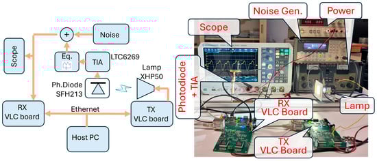 The set-up employed in the experiments is shown in Figure 7. Two boards, designed in-house specifically for VLC applications, make possible the real-time implementation of the proposed method. They are two identical boards, one of which is here used for TX (TX VLC board), while the other is for RX (RX VLC board). These boards include a complete TX/RX front-end for VLC and a 10M50DAF848 FPGA that makes possible real-time signal elaboration. The boards are connected via Ethernet to a host PC (not visible in the photo). In the PC, a Matlab® interface allows the user to manage and monitor the boards operations. Interested readers can find a thorough description of the VLC board in [35].