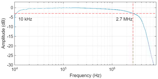 The amplifier integrated in the TX board, which powered the lamp, was set for a DC current of 0.6 A and a modulation index of 50%. A preliminary experiment was conducted to verify the bandwidth of the channel, including the amplifier, lamp, TIA, equalizer, and RX board. The result, illustrated in Figure 8 shows a regular, almost flat, bandwidth that extends between 10 kHz and 2.7 MHz.