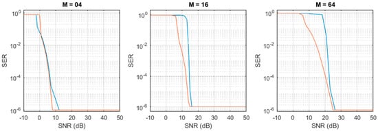 Measured (blue curve) and simulated (orange curve) SER obtained for (left to right) M = 04, M = 16, and M = 64 (left). The SER values have a 95% confidence.