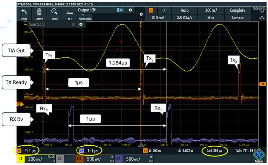 The proposed MODEM processes a continuous flow of symbols; no pauses among symbols or data-packets are required. In Figure 10, the start of transmissions of the three symbols Tx1, Tx2, and Tx3 is visible, together with the reception of the corresponding symbols Rx0 and Rx1. Each symbol is transmitted and received every Tb = 1 μs.