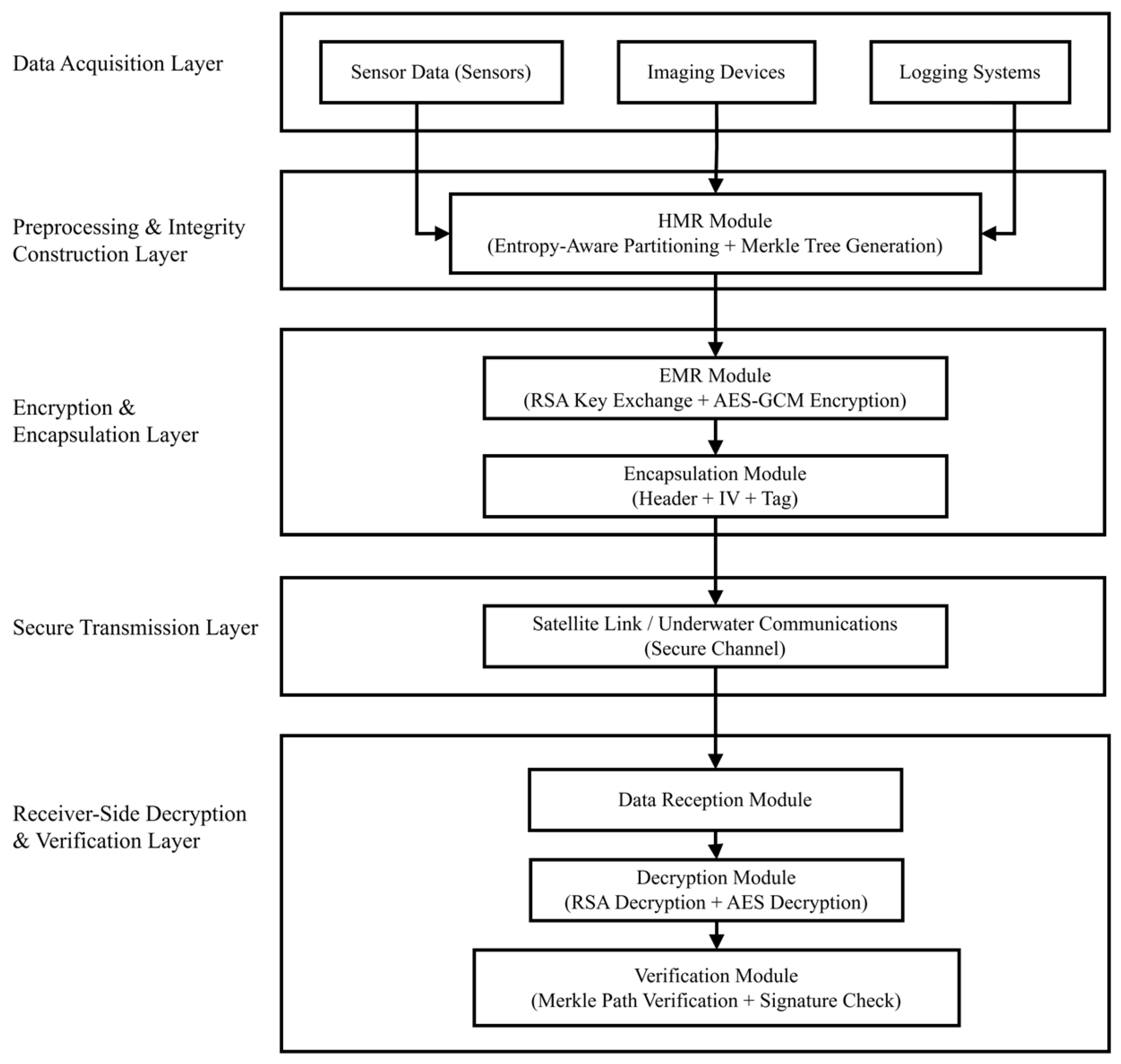 Chicago/Turabian StyleWang, Hanyu, Mo Chen, Maoxu Wang, and Min Yang. 2026. "A Hybrid Hash–Encryption Scheme for Secure Transmission and Verification of Marine Scientific Research Data" Sensors 26, no. 3: 994. https://doi.org/10.3390/s26030994