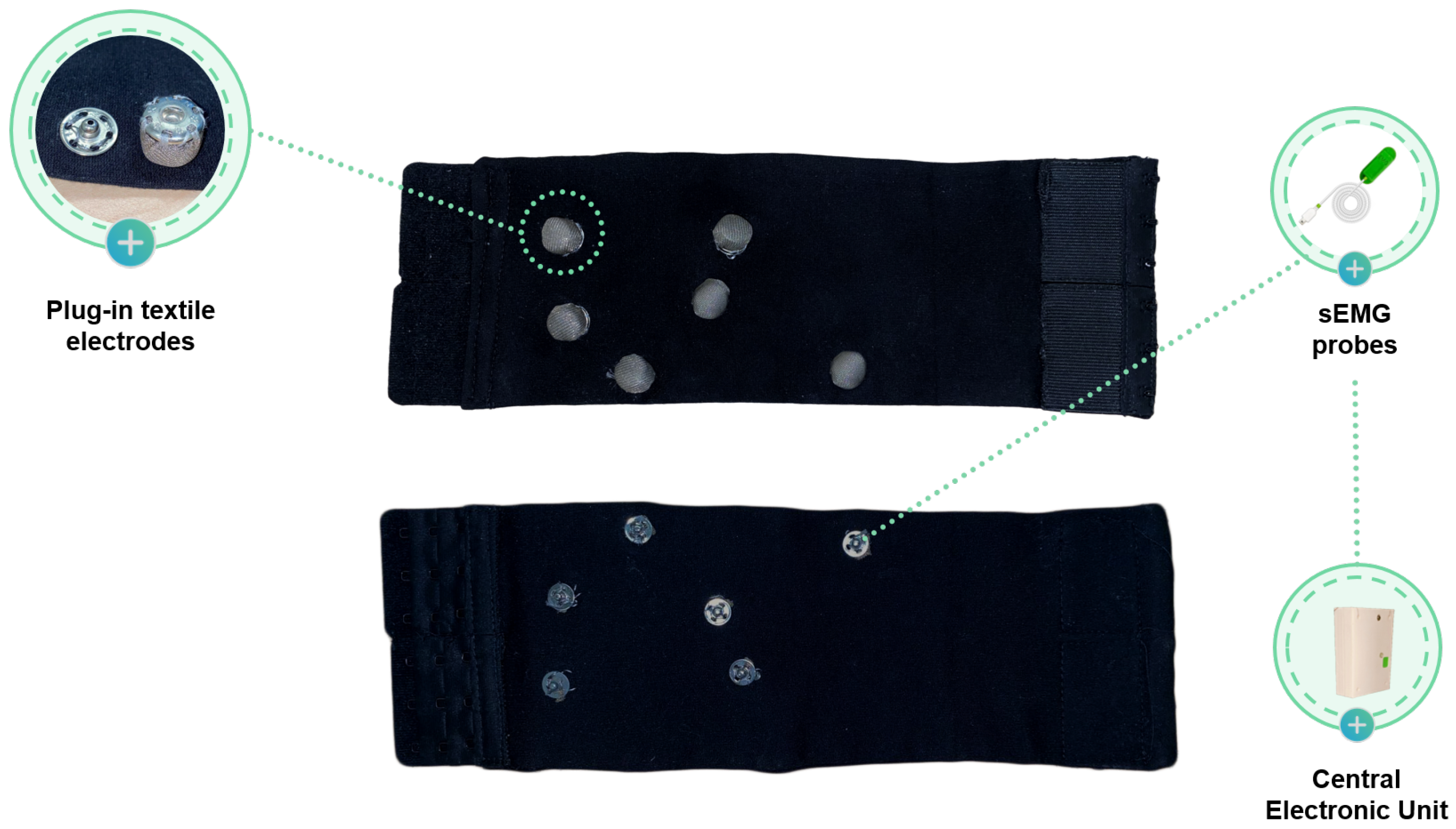 Two EMG Sensor modules (assembled version) from BITalino (PLUX Wireless Biosignals S.p.A., Lisbon, Portugal) were connected to the textile band for signal recording. These sensors are designed for high-quality sEMG acquisition and were interfaced with the central electronic unit for signal acquisition.