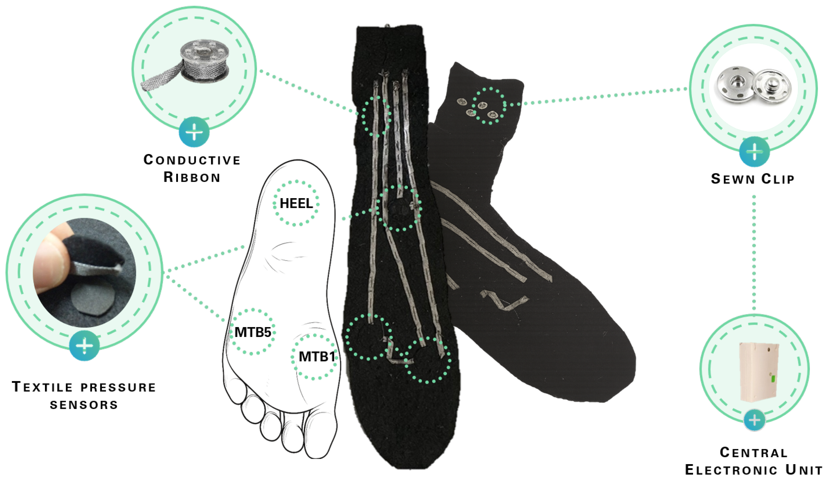 14]. The insole incorporates three circular pressure sensors (diameter 1 cm) positioned at key points of the plantar arch where body weight is distributed: the heel, the first, and the fifth metatarsal bones. These sensors are made of EeonTex™ fabric (Eeonyx Corp., Pinole, CA 94564, USA), a conductive and nonwoven microfiber with piezo-resistive functionality (surface resistivity 2000 ohm/sq), they offer a reduction of the electrical resistance to the application of force. They were embedded in a felt insole that can be worn inside the shoe and easily removed and washed, ensuring reusability and hygiene.