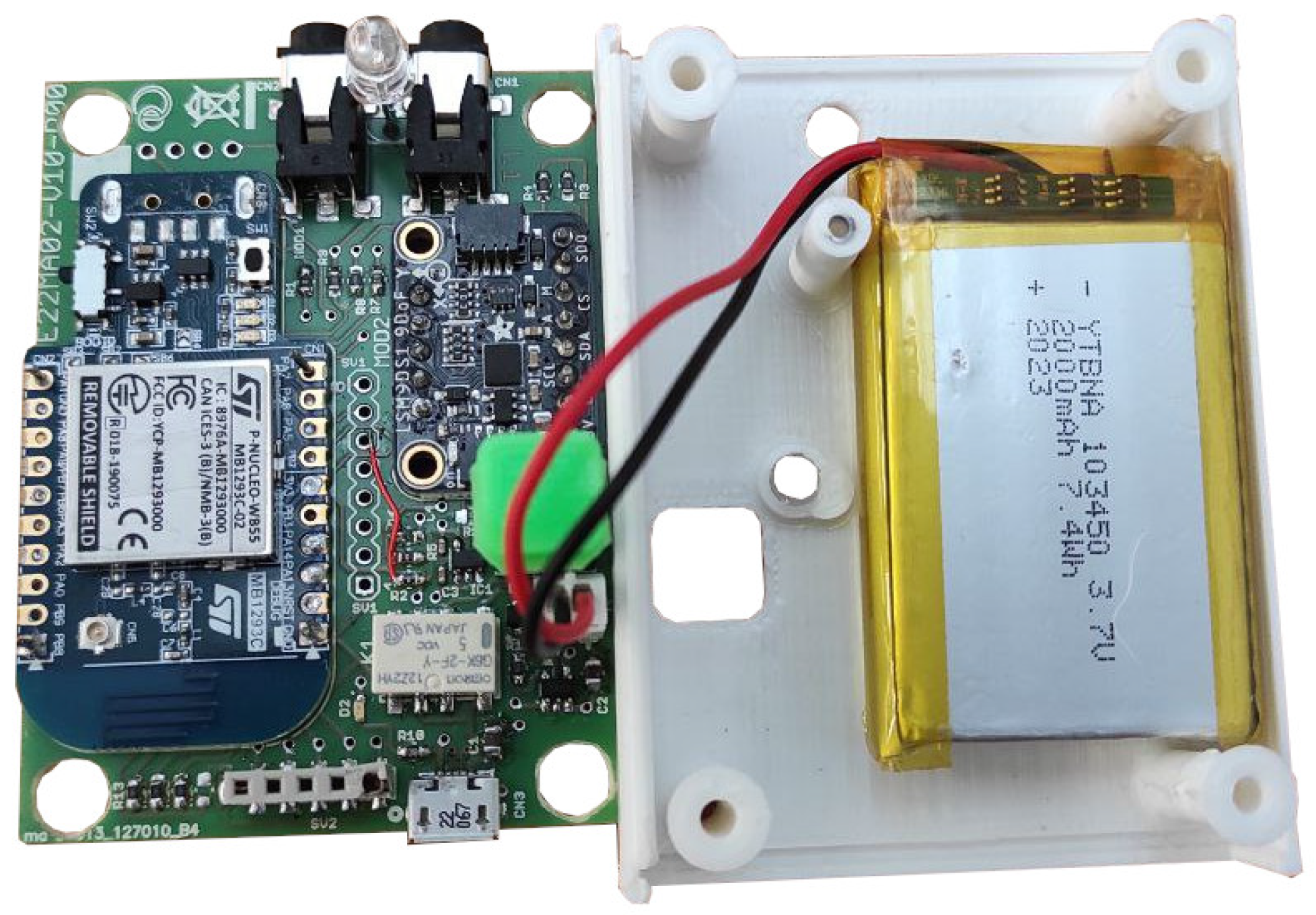 Internal view of the central electronic unit, showing the STM32WB-based acquisition board (left) and the integrated LiPo battery within its housing (right).