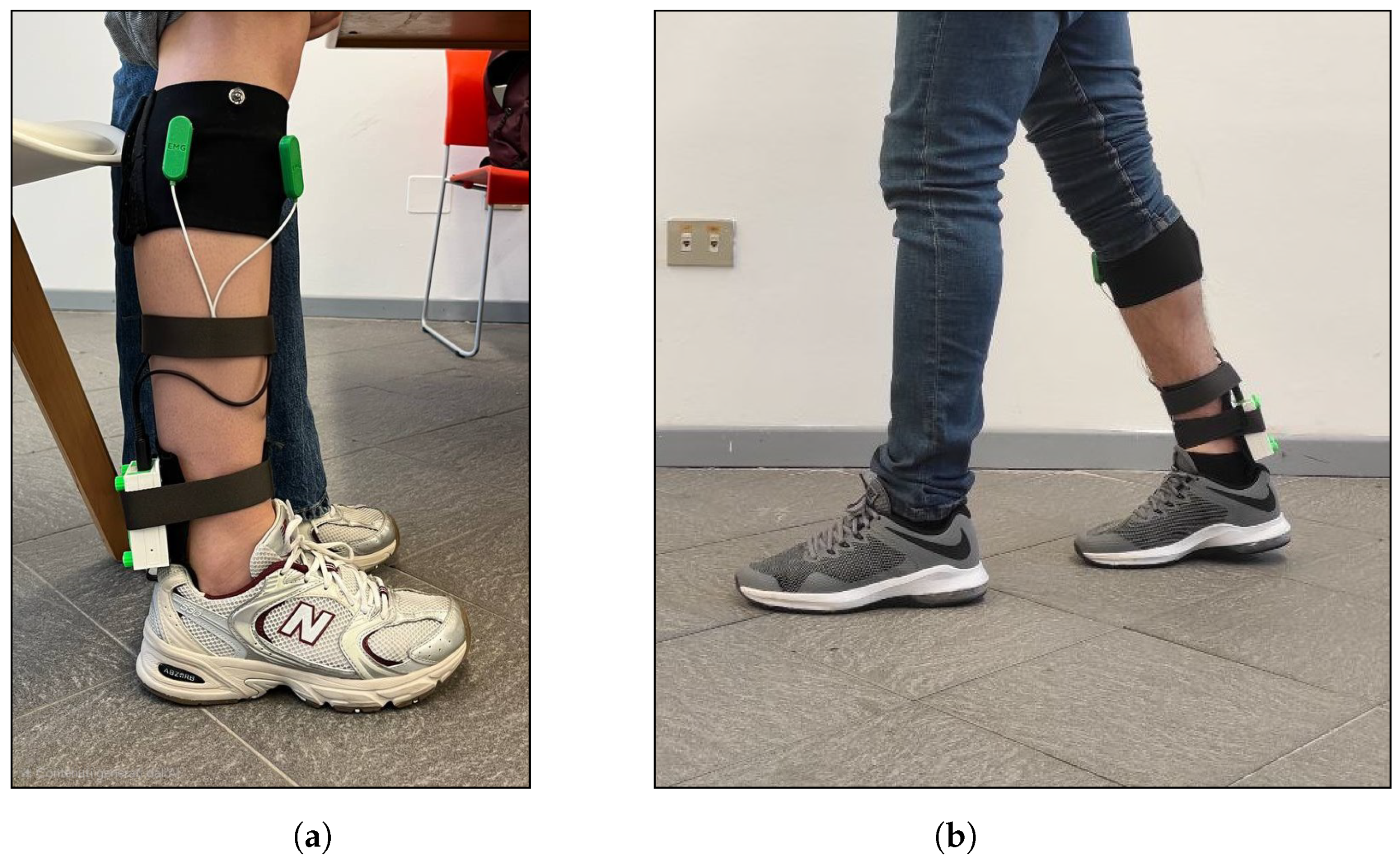 The study involved eleven healthy subjects (4 women and 7 men; age: years; height: cm; weight: kg; BMI: ). The study was conducted in accordance with the Declaration of Helsinki with the approval of Local Ethics Committee (protocol N. 313/2024, study N. 1610/CEL), and informed consent was obtained from all subjects involved in the study. All acquisitions were performed on the right leg and right foot to ensure consistency across participants. Each trial began with a short preliminary phase designed to establish a baseline sEMG. Using the application’s timer, the subject remained upright and still for five seconds before receiving the start signal to begin walking on a straight path of ten meters. This static period provided an sEMG signal close to resting conditions, used to correct the offset during data processing. Although the upright posture requires minimal muscular effort, this was considered negligible compared to the activity recorded during gait. Each subject performed five repetitions of the walking task.