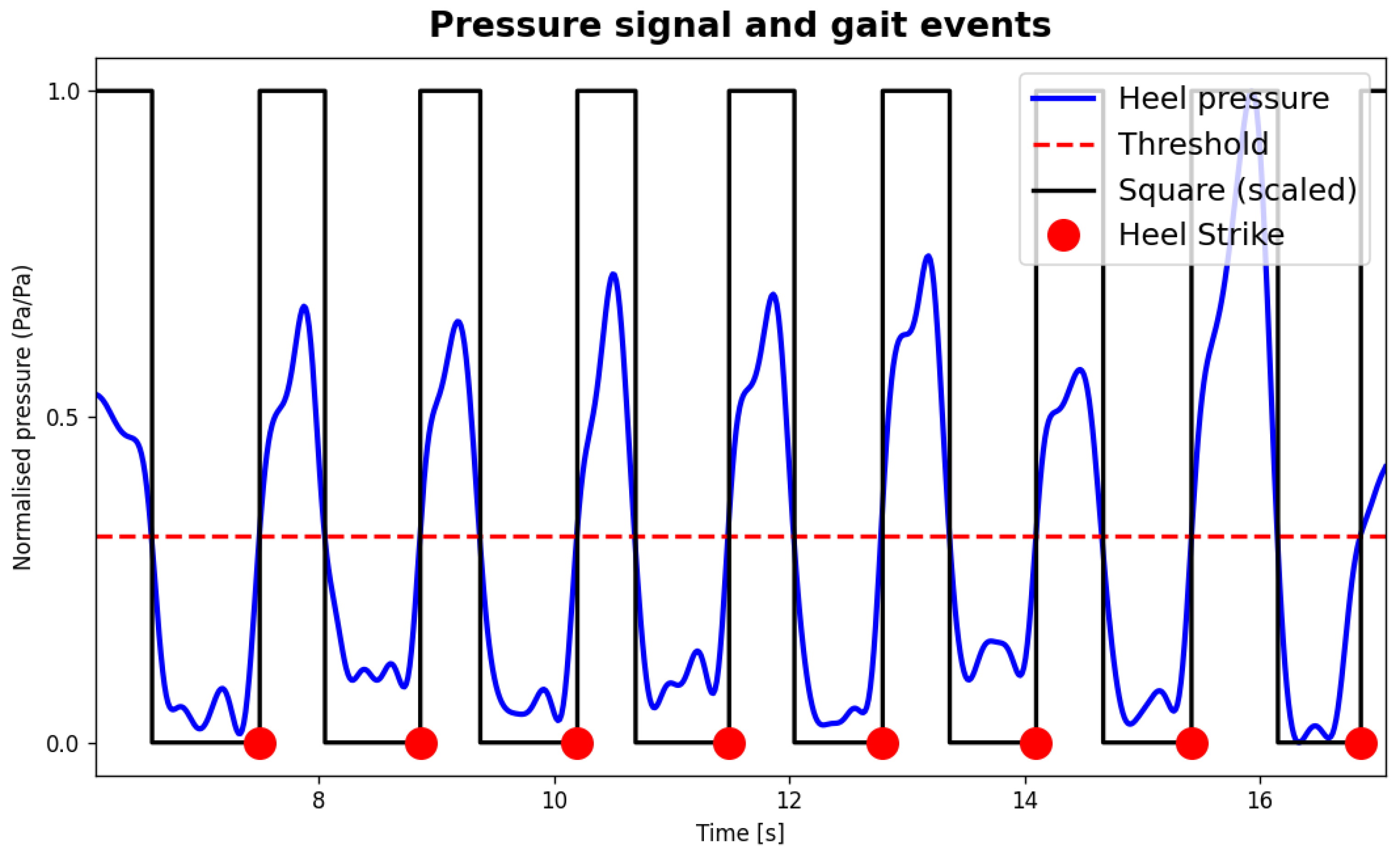 Representation of pressure signal processing. The red-dashed threshold was applied on the filtered heel pressure signal to produce a foot-switch square wave. The instant at which heel pressure overcomes the threshold corresponds to the heel strike event.