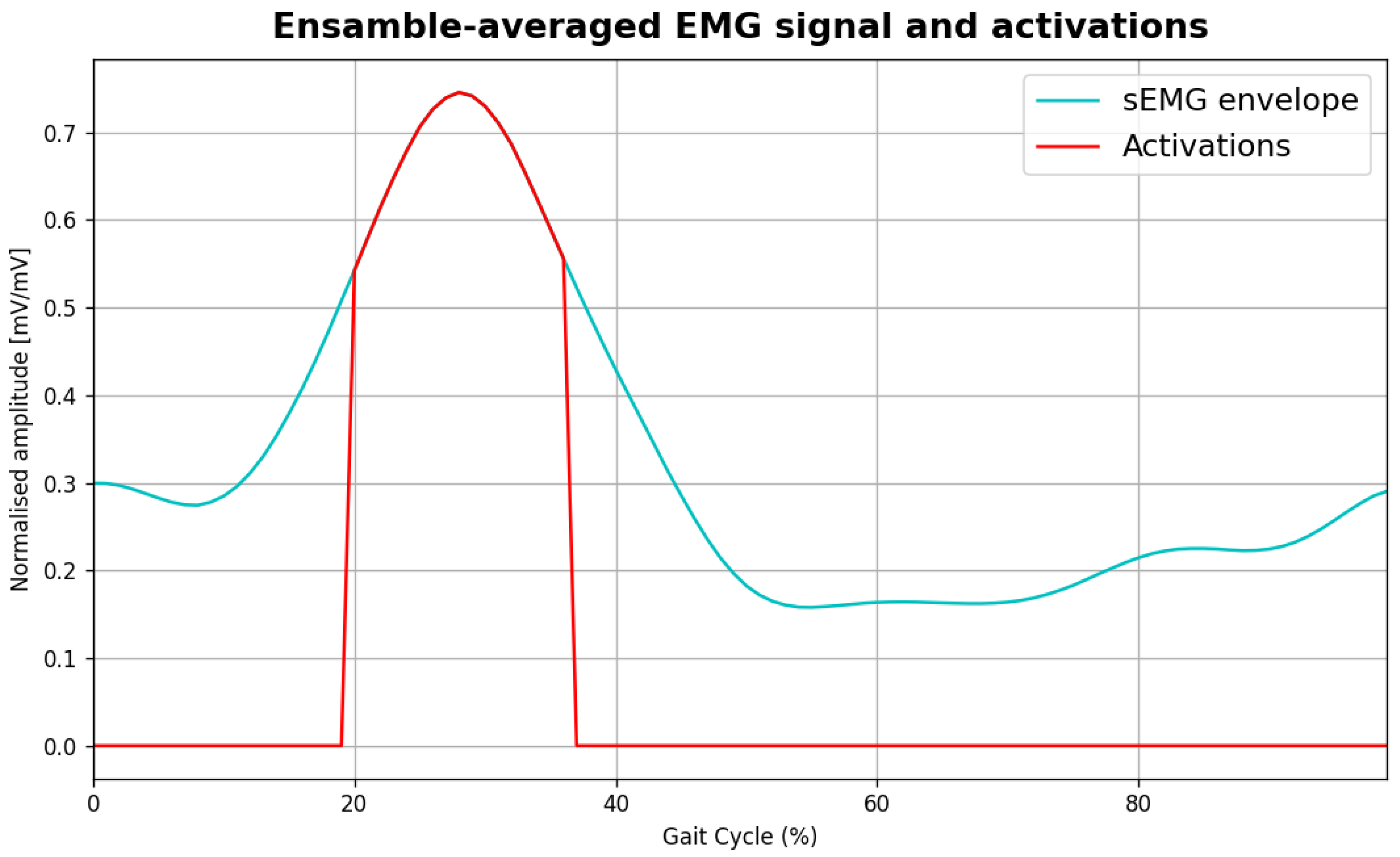 15] and time normalisation to ensure comparability across steps. For each walking task, normalised envelopes were averaged to obtain an ensemble-averaged EMG, representative of the TA and GL muscles. Muscle activation was detected using a statistical threshold-based criterion, as commonly adopted in EMG onset detection methods [