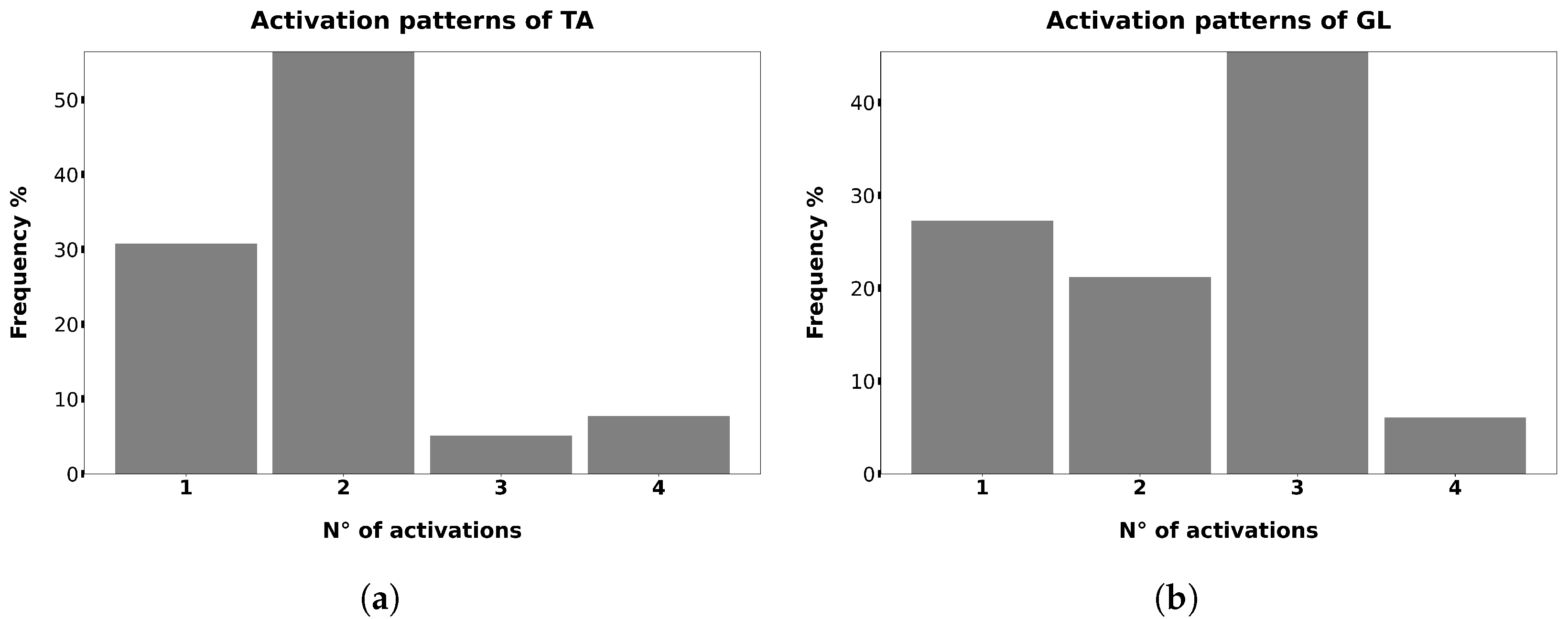 Frequency distribution of the activation patterns observed during the gait cycle. Panel (a) reports the distribution for the TA muscle, whereas panel (b) reports the corresponding distribution for the GL muscle.