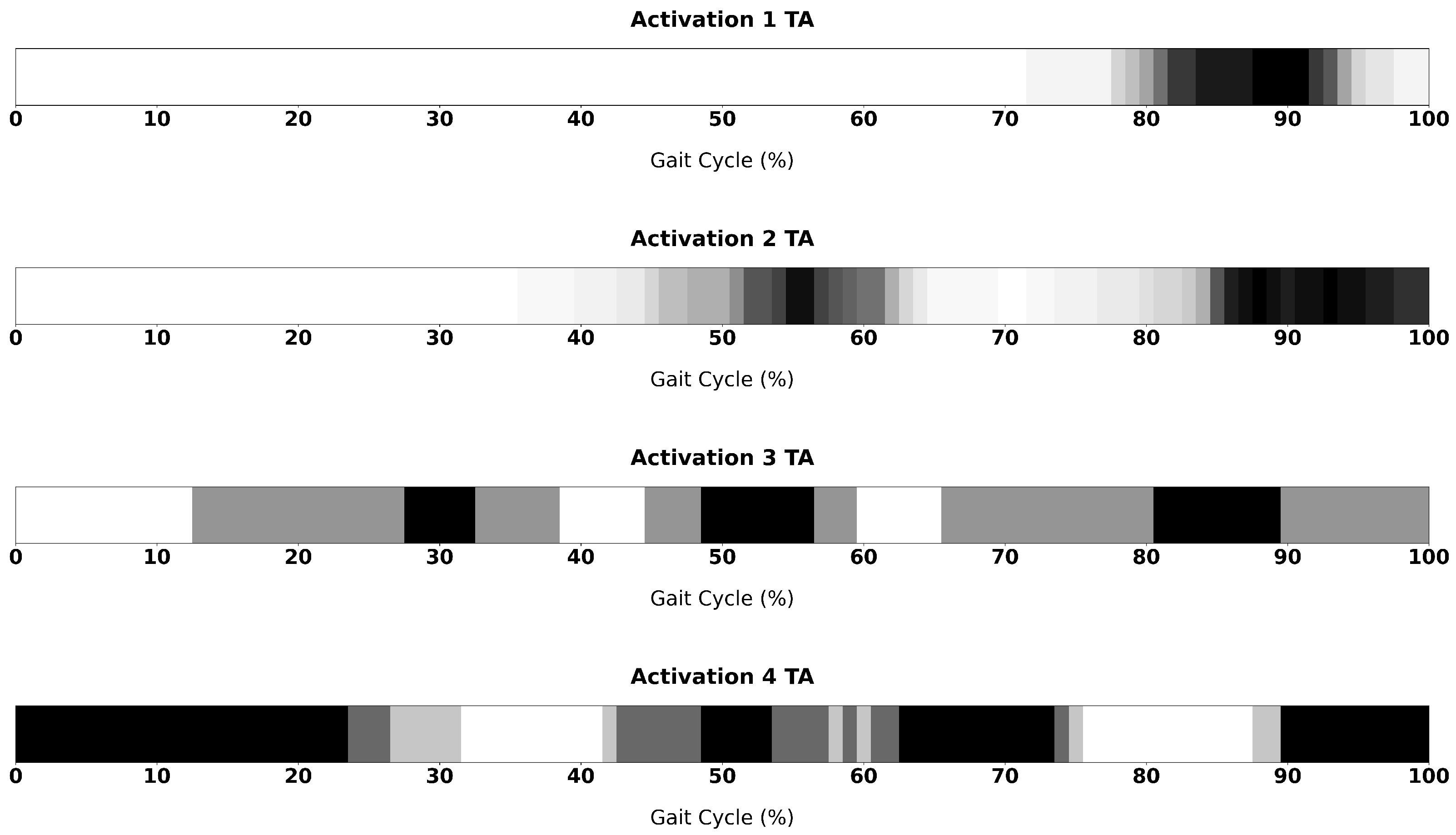 Temporal distribution of TA activation across the gait cycle for subjects exhibiting one to four activation intervals. Each row represents an activation modality, while the grayscale maps indicate the density of ON periods across the normalised gait cycle (%GCT). Darker regions correspond to higher activation frequency among subjects.