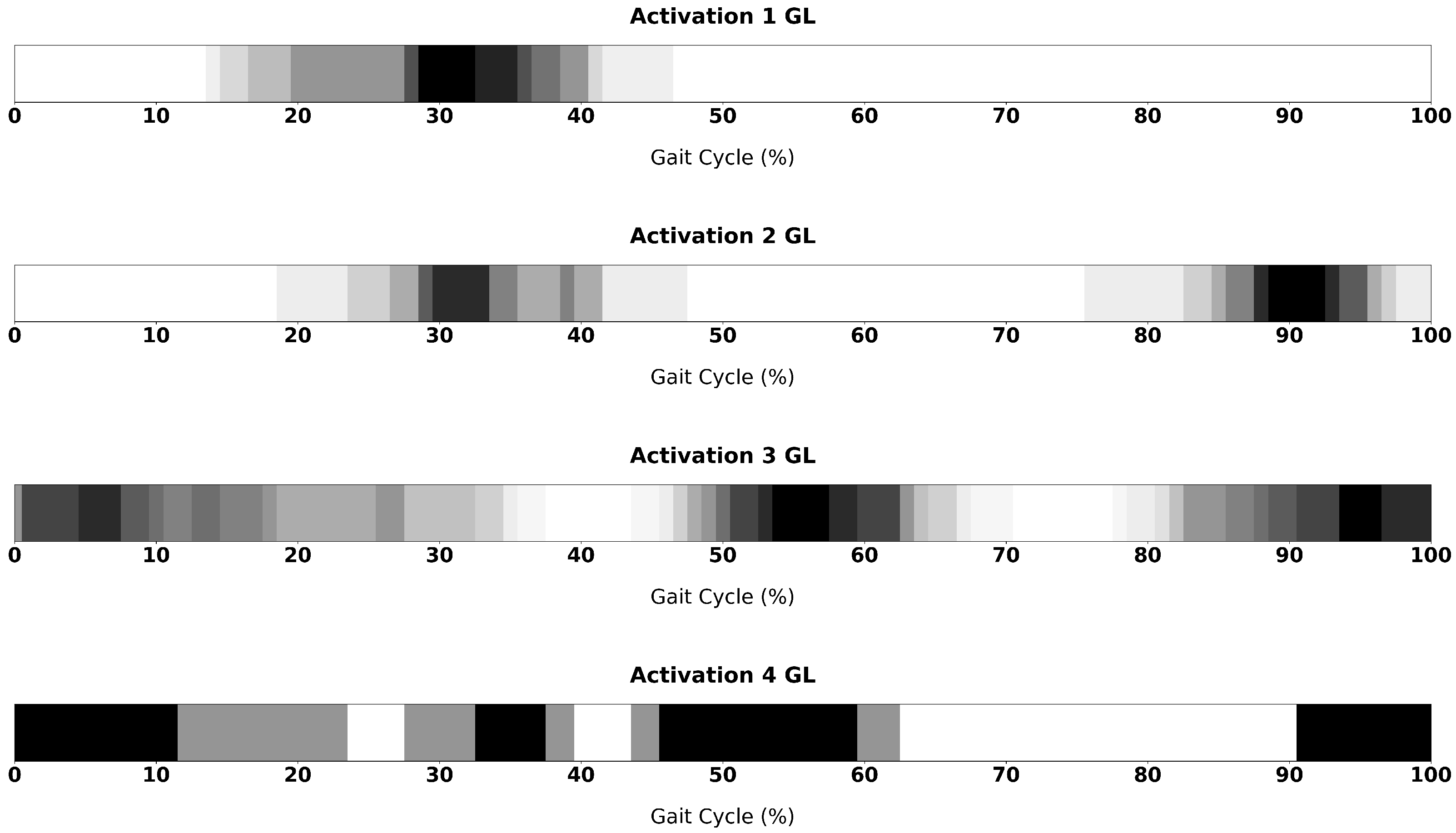 Temporal distribution of GL activation across the gait cycle for subjects exhibiting one to four activation intervals. Each row represents an activation modality, while the grayscale maps indicate the density of ON periods across the normalised gait cycle (%GCT). Darker regions correspond to higher activation frequency among subjects.
