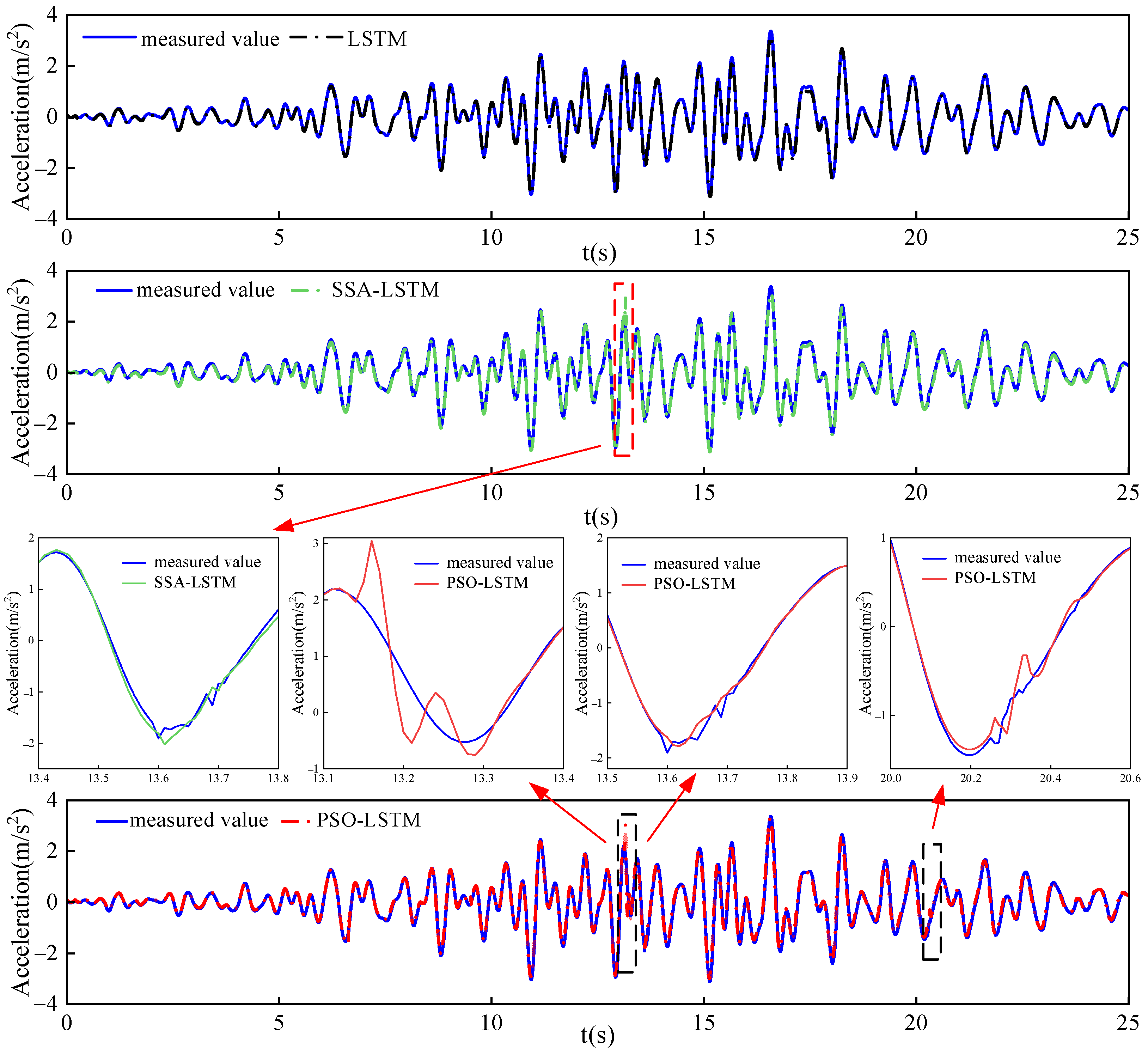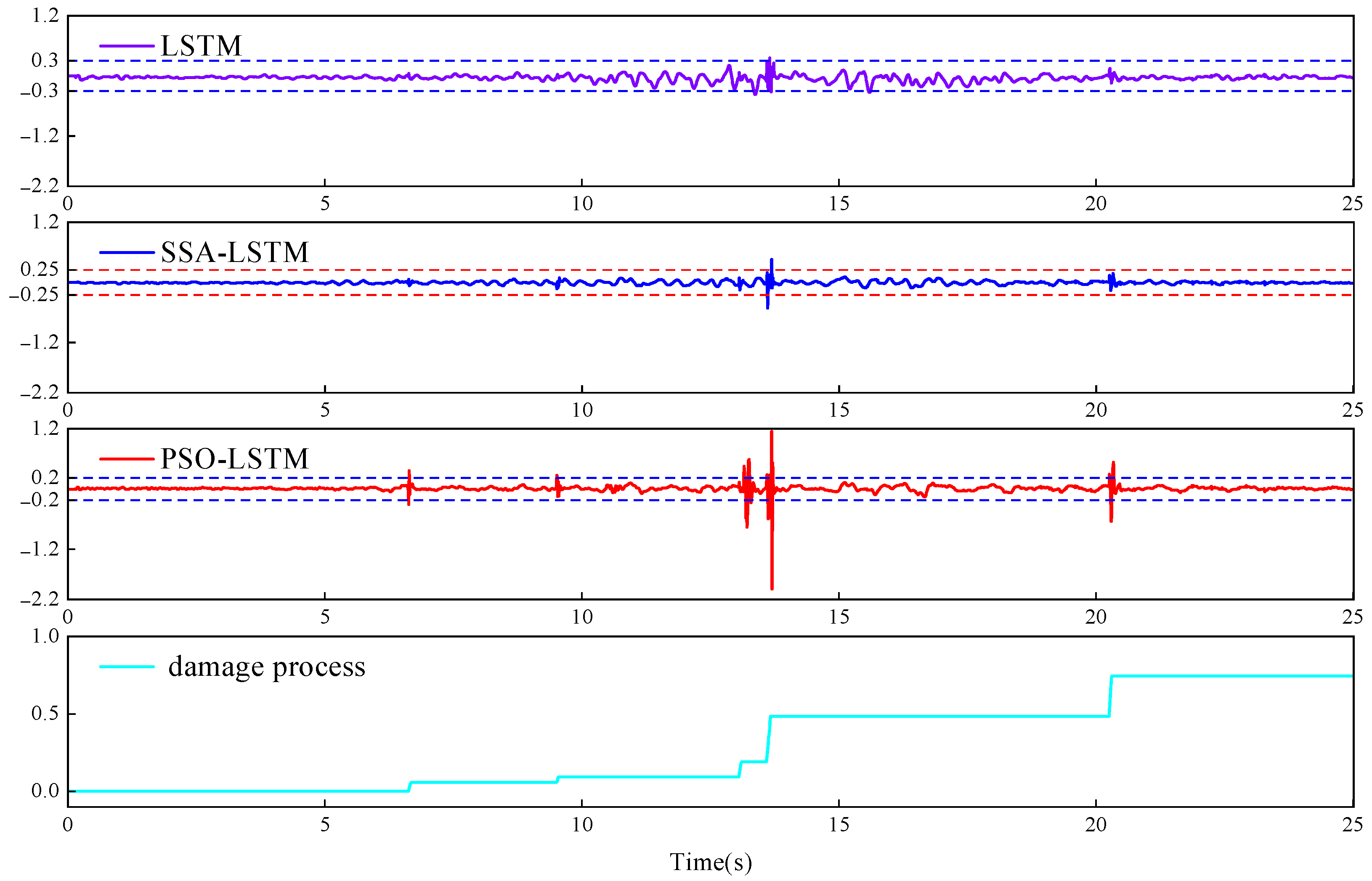 - The PSO algorithm was employed to optimize key hyperparameters of the LSTM network, including the number of neurons in the hidden layer, maximum training epochs, and initial learning rate. This optimization effectively reduced the subjective bias caused by manual parameter tuning and enhanced the accuracy of structural damage identification from dynamic responses. Comparative results demonstrated that the PSO-LSTM model could accurately capture abrupt changes in dynamic responses, resulting in increased sensitivity and reliability. In terms of damage detection accuracy and overall performance, the PSO-LSTM model outperformed both the SSA-LSTM and standalone LSTM models.