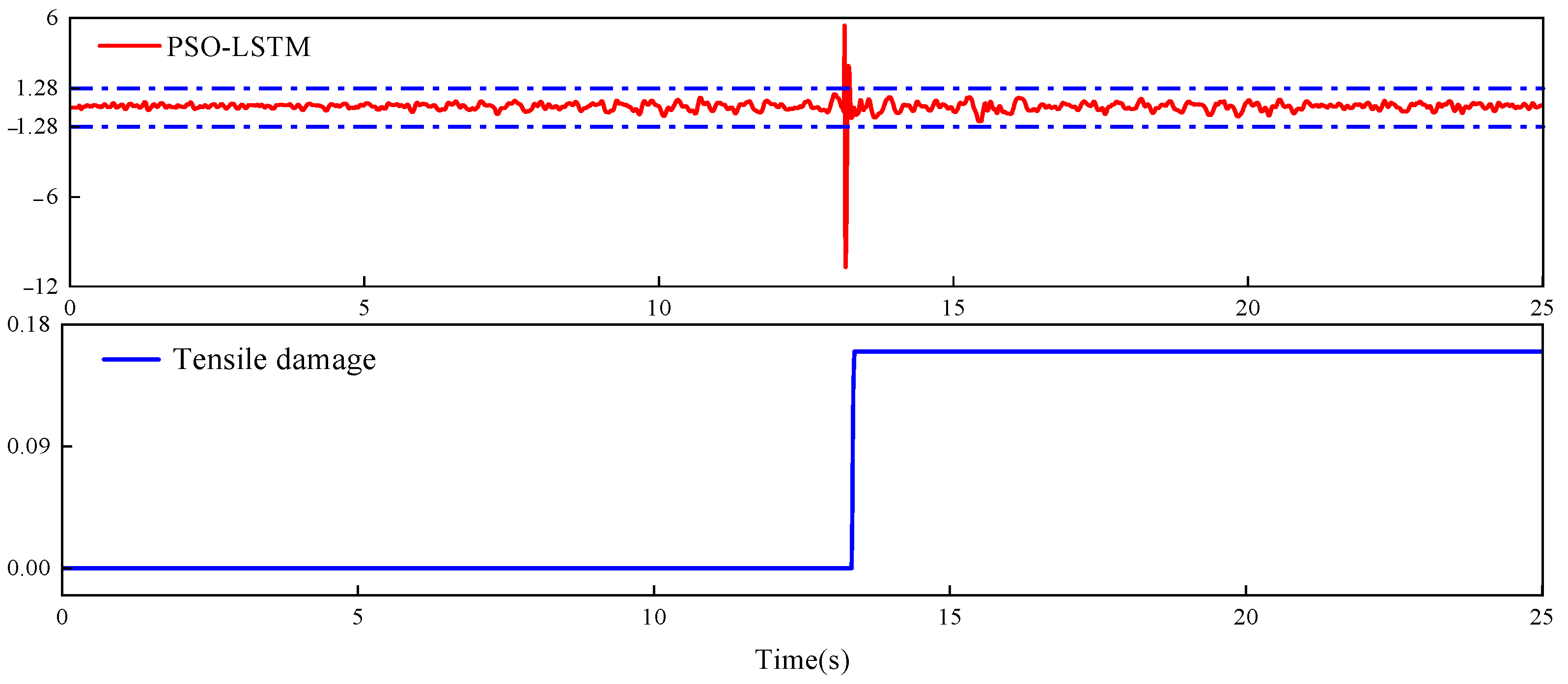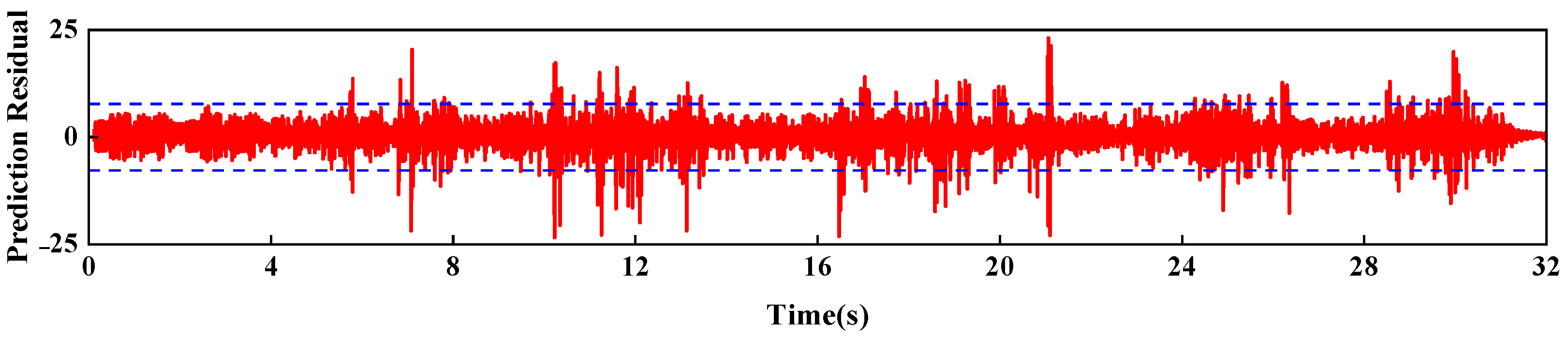 - Residual sequence: The residual et was calculated as the difference between the measured signal yt and the predicted value , expressed as . Structural damage induced significant deviations of et from its baseline statistical distribution—specifically, exceeding the threshold defined by the mean ± 3σ.