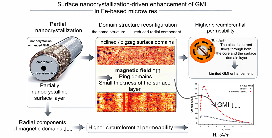Despite numerous studies addressing either GMI or domain structure evolution, investigations that consider both phenomena simultaneously are still limited. In particular, the influence of surface nanocrystallization on the domain structure and its relationship to the high-frequency impedance of Fe-based alloy microwires have not been sufficiently explored.