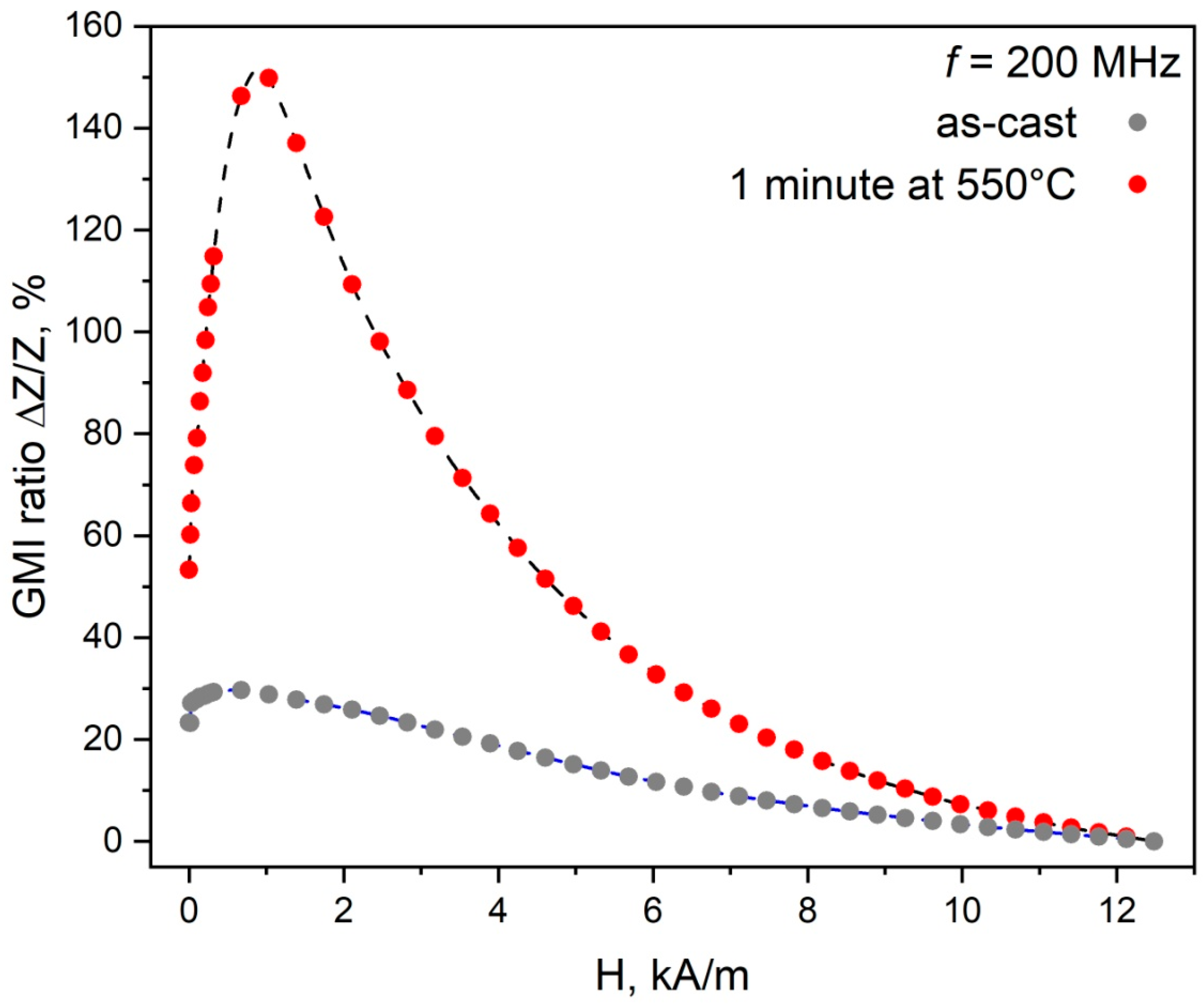 Figure 1 shows the dependence of the GMI effect on the external magnetic field at a frequency of 200 MHz for the as-cast and annealed microwires.