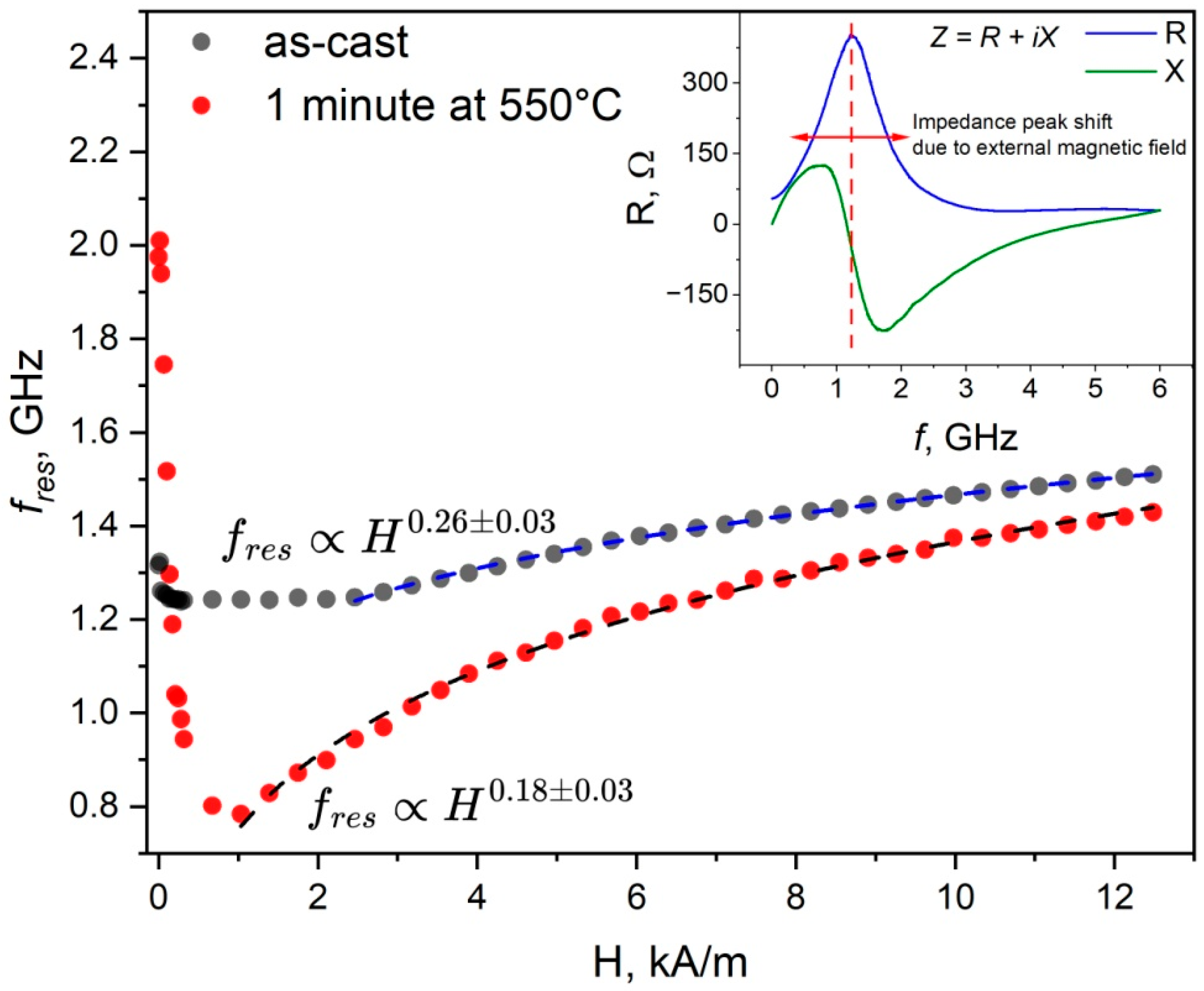 Figure 2 shows typical frequency dependencies of the resistance and reactance of microwires. They demonstrate the resonant behavior of the real and imaginary impedance components: the resistance has a maximum at a certain frequency, while the reactance curve crosses zero. Such spectral behavior of the impedance components has been widely reported and is associated with ferromagnetic resonance. However, given the geometry and complex domain structure of the sample, the observed resonant response should be considered an effective high-frequency resonance arising from domain wall dynamics and magnetization rotation rather than classical ferromagnetic resonance in thin films.