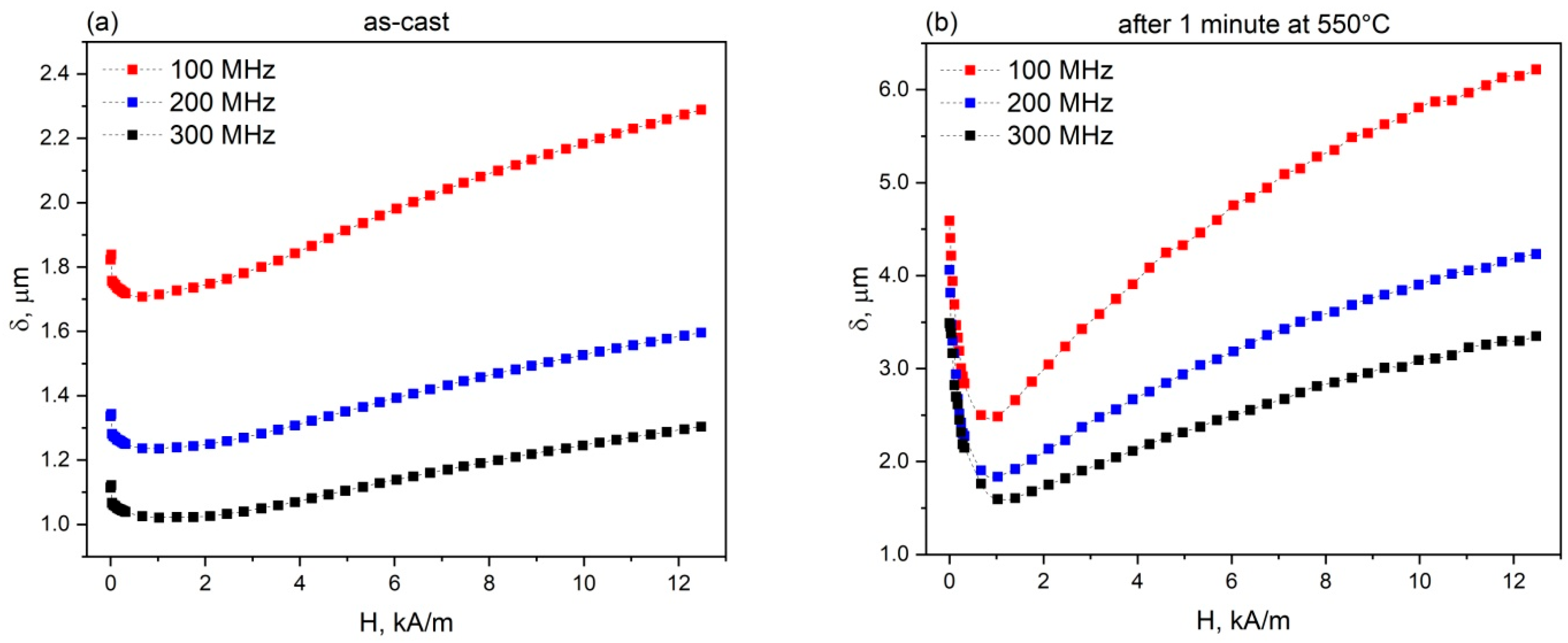 Figure 3 illustrates the dependence of the skin depth at the current frequencies of 100–300 MHz on the external magnetic field in the as-cast and annealed microwires.