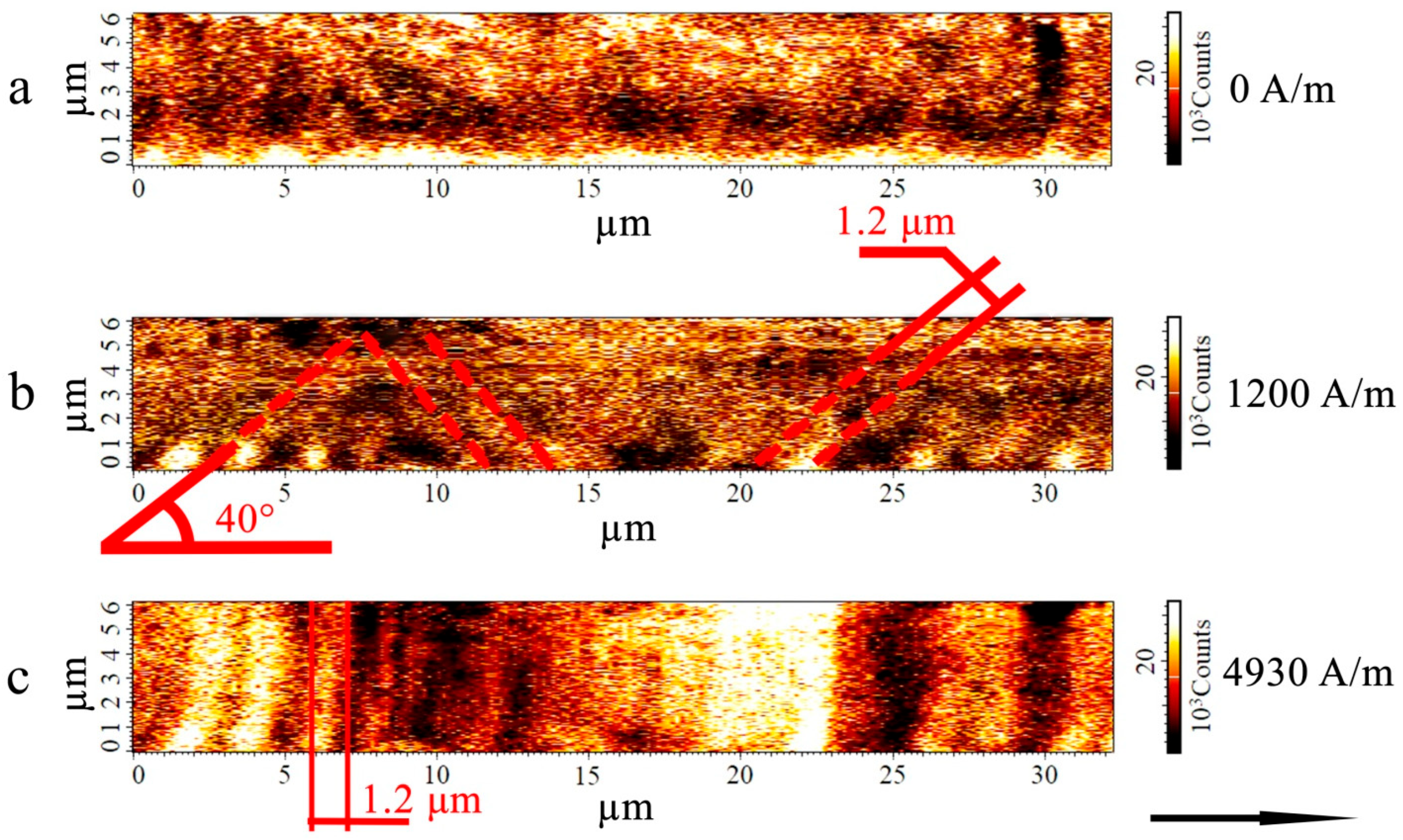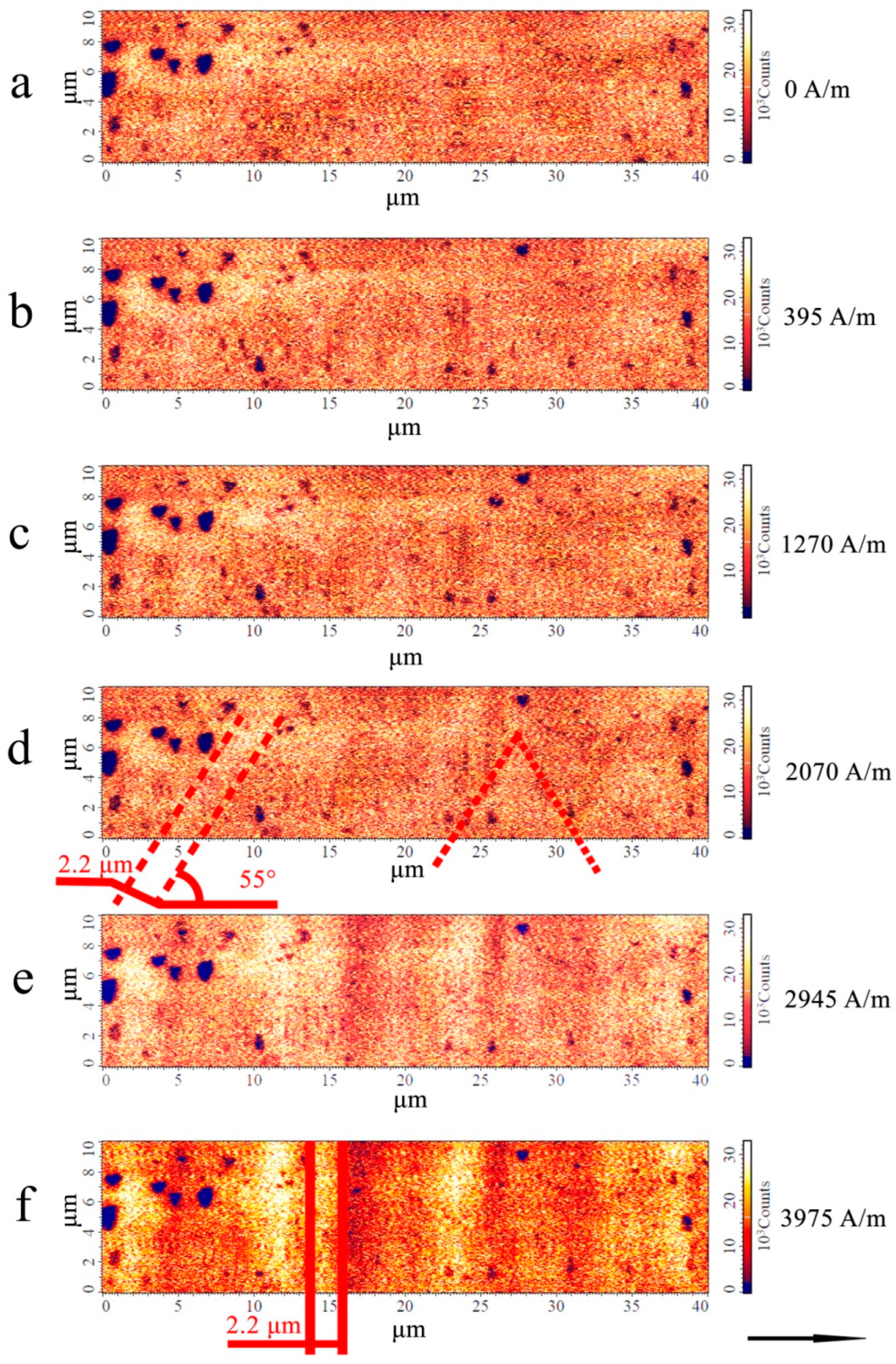 Figure 6 show, annealing of the microwire leads to an increase in the average domain size from 1.2 μm to 2.2 μm. At the same time, the inclination angle of the domains relative to the microwire axis also increases (from 40 to 55°). This may result from the mutual redistribution of individual stress tensor components; however, it is impossible to draw more detailed conclusions from the data obtained. Despite the weak phase contrast of the observed domain structure, inclined and individual zigzag domains are still detectable in fields below 2000 A/m.