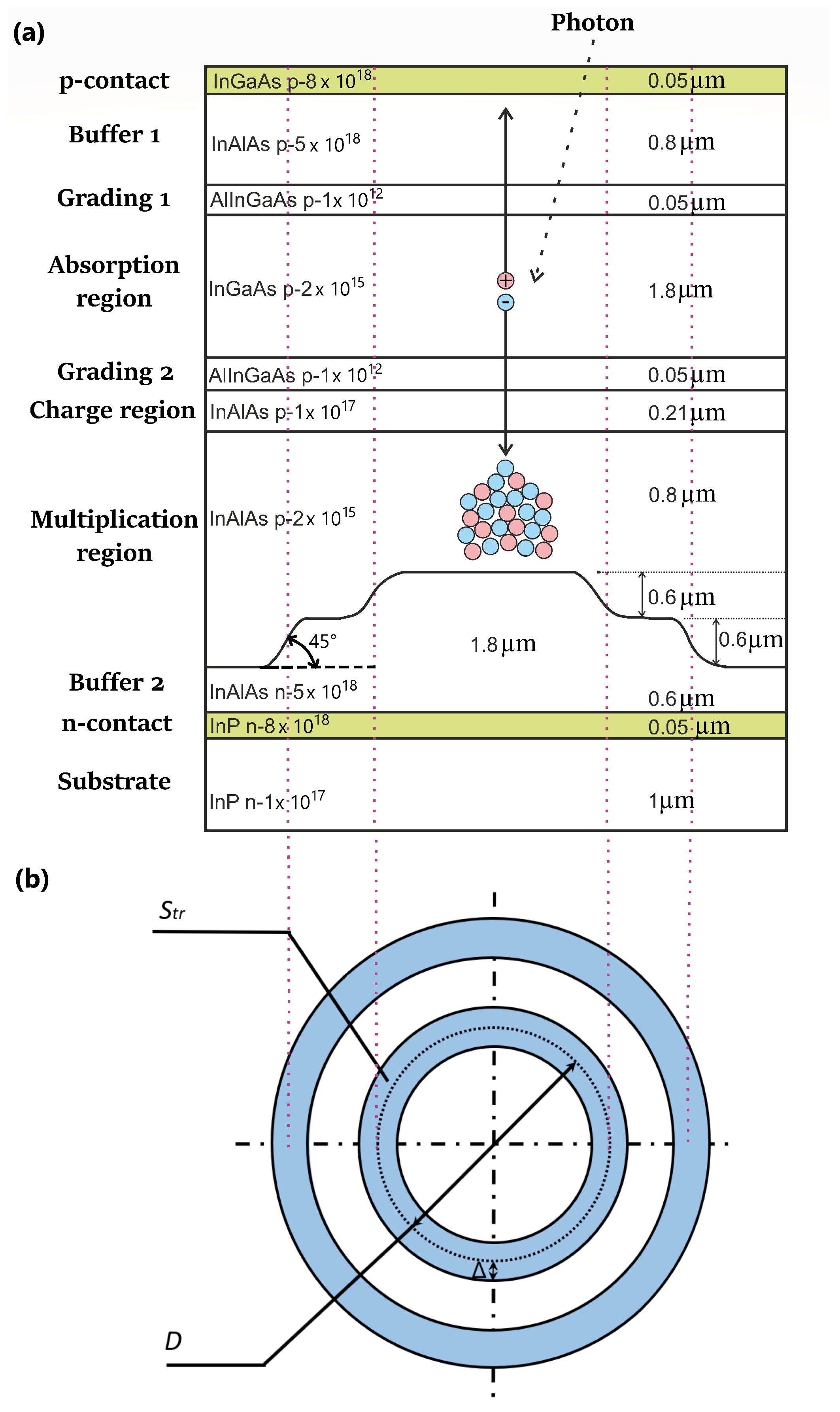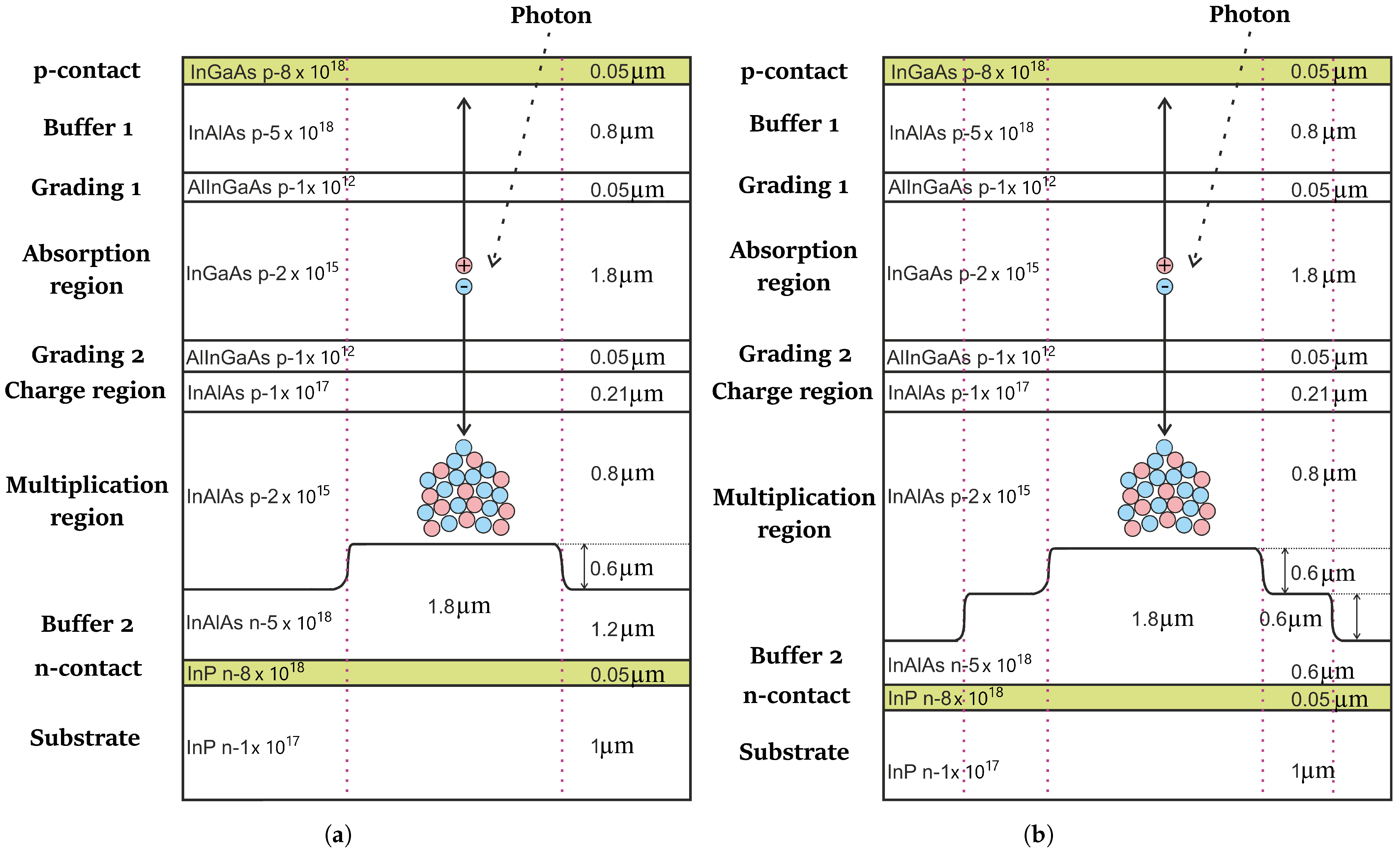 The simulated InGaAs/InAlAs SPAD structure is based on a design realized in works such as [