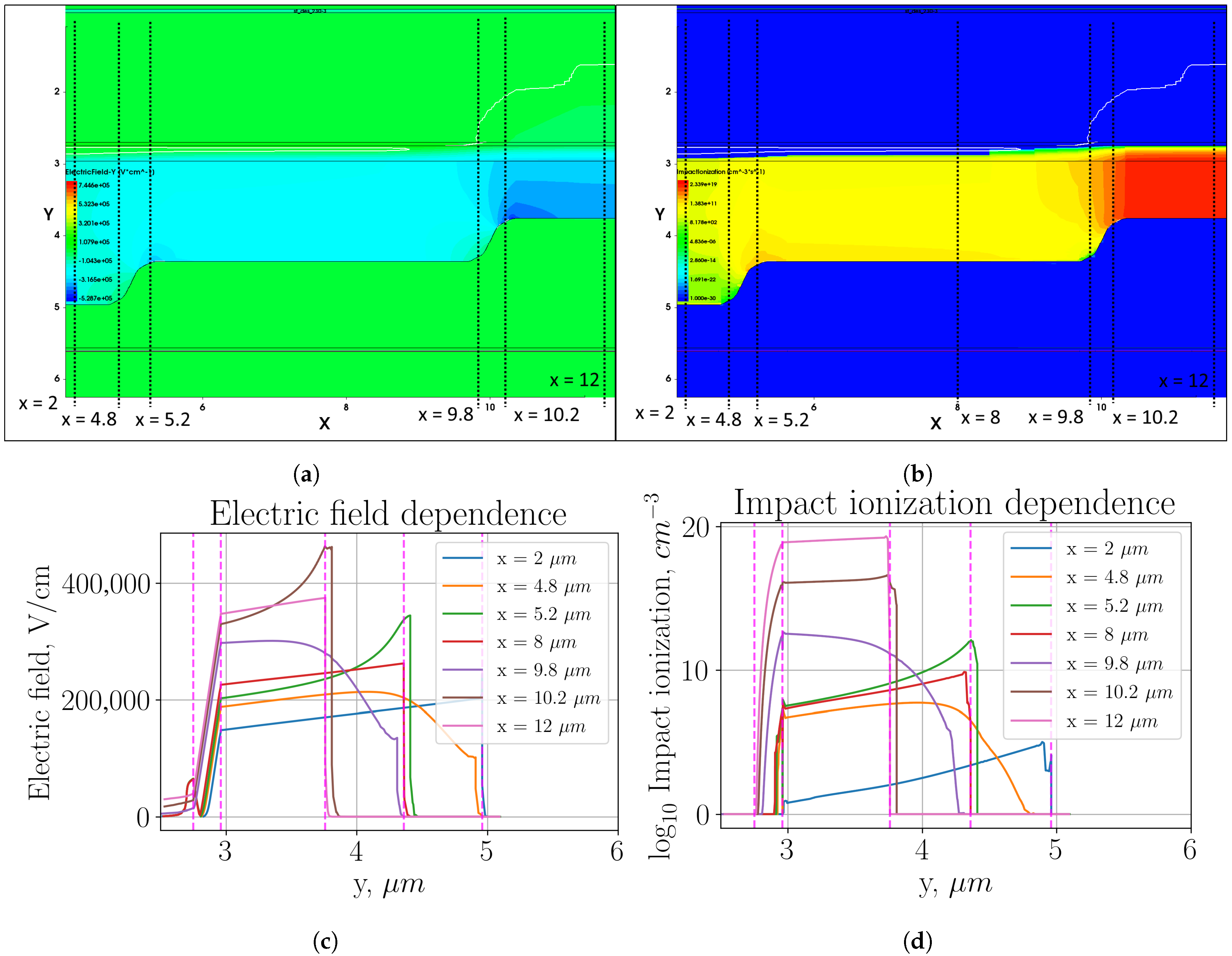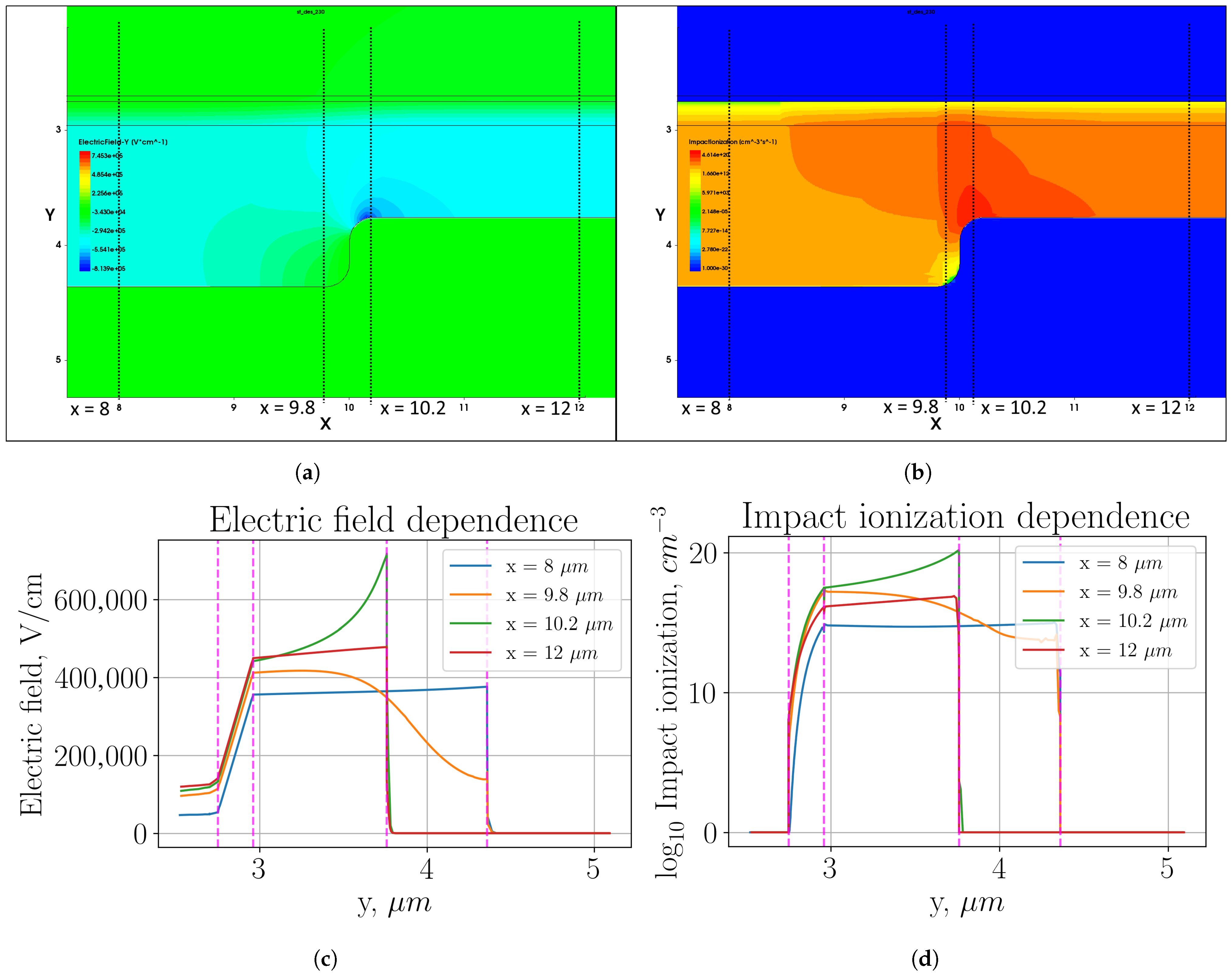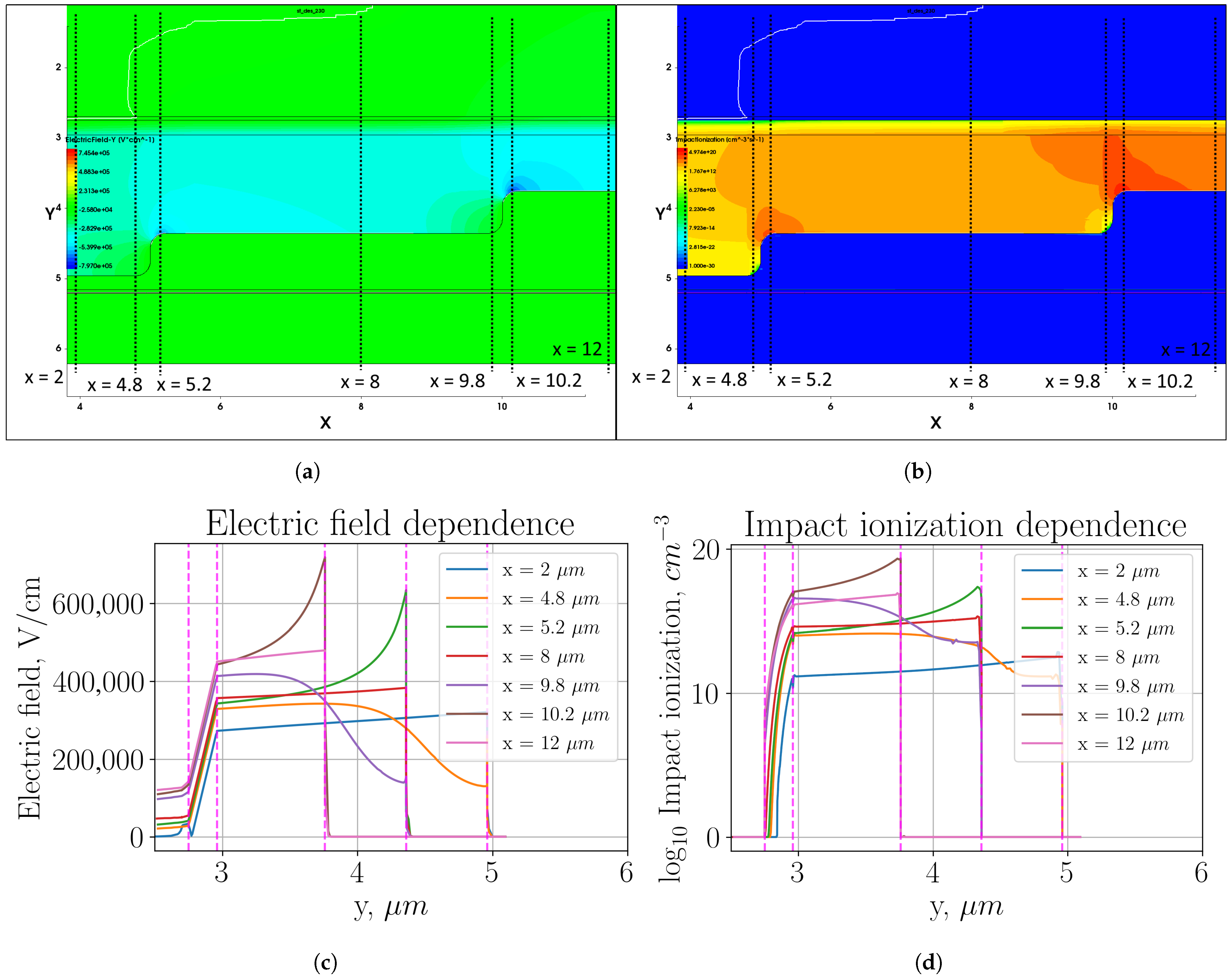 Figure 2 shows heat maps of the electric field distribution and impact ionization (plots (a) and (b), respectively) in the multiplication region, as well as profiles of these parameter distributions in individual sections (plots (c) and (d), respectively).