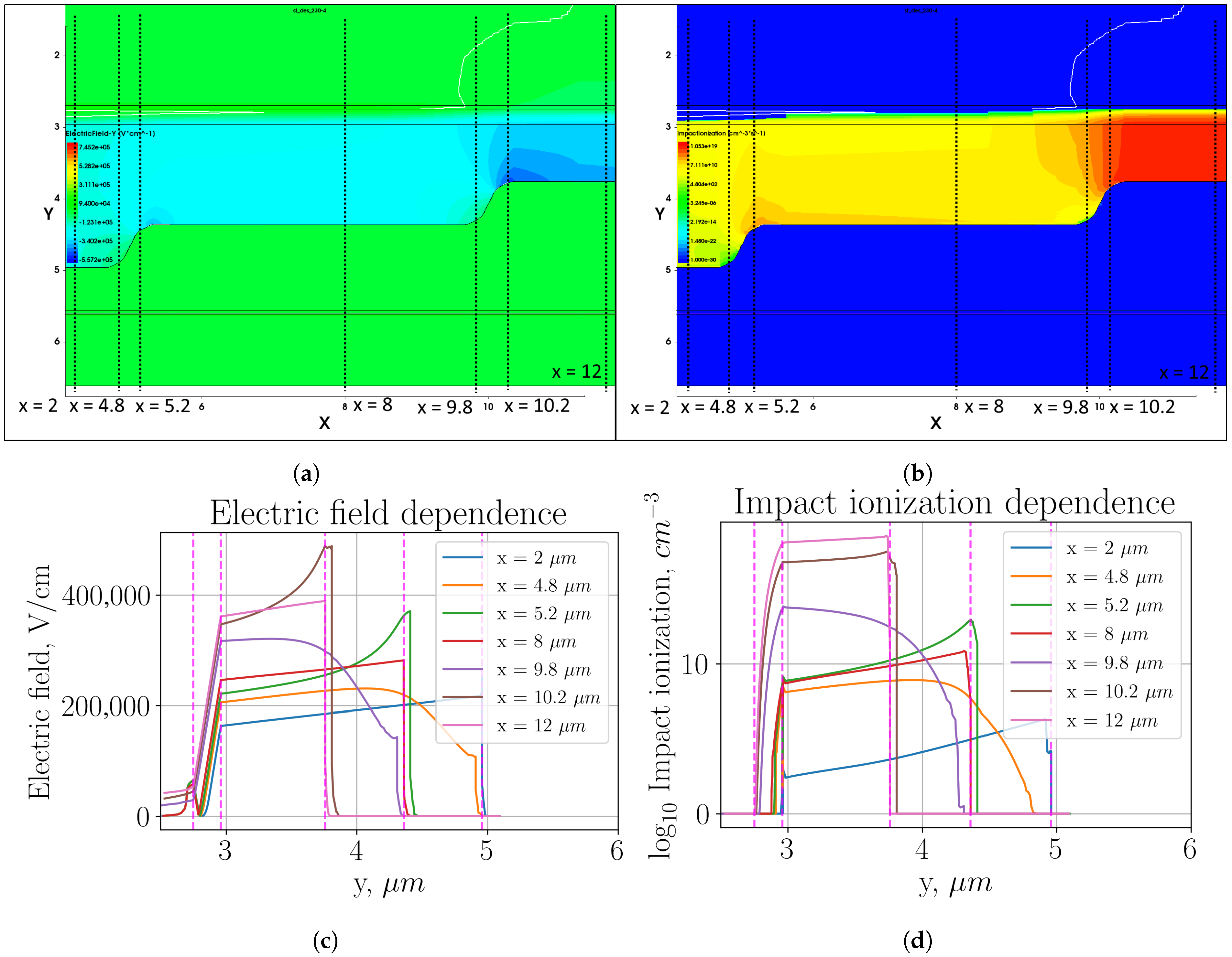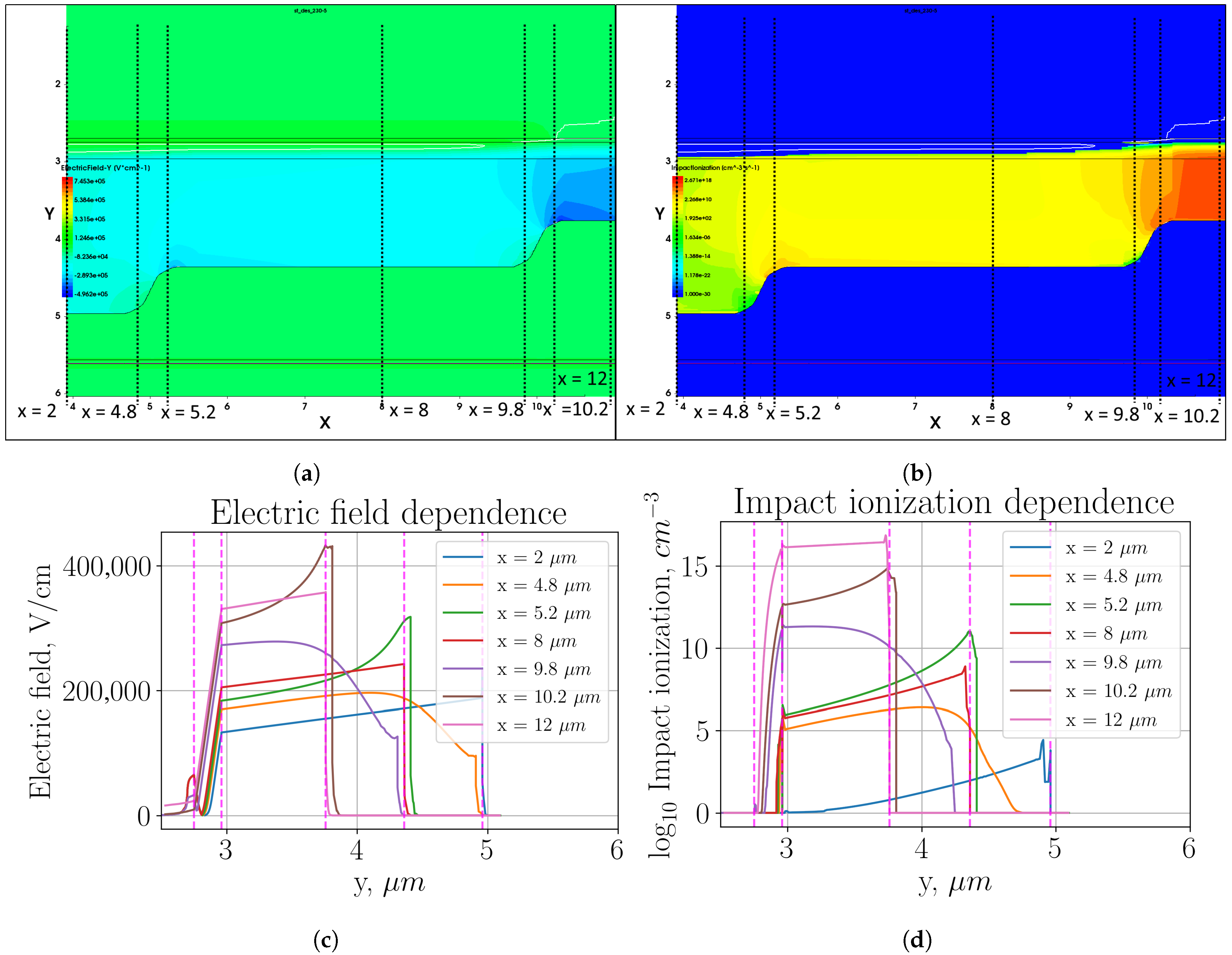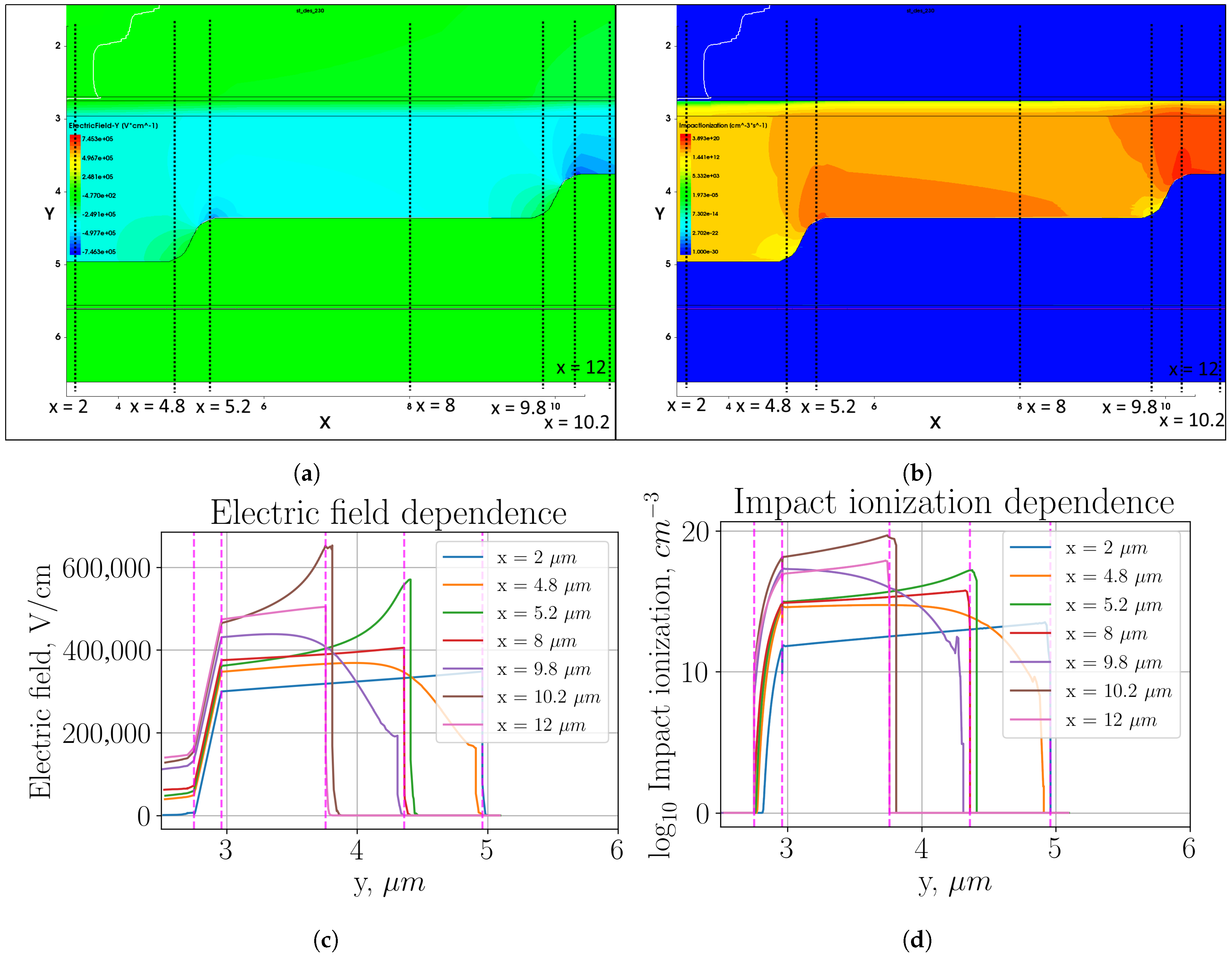 Figure 2 shows heat maps of the electric field distribution and impact ionization (plots (a) and (b), respectively) in the multiplication region, as well as profiles of these parameter distributions in individual sections (plots (c) and (d), respectively).