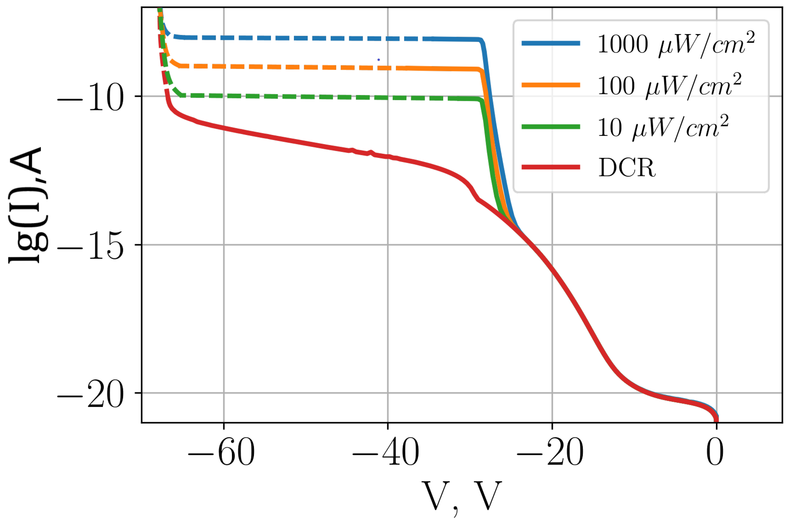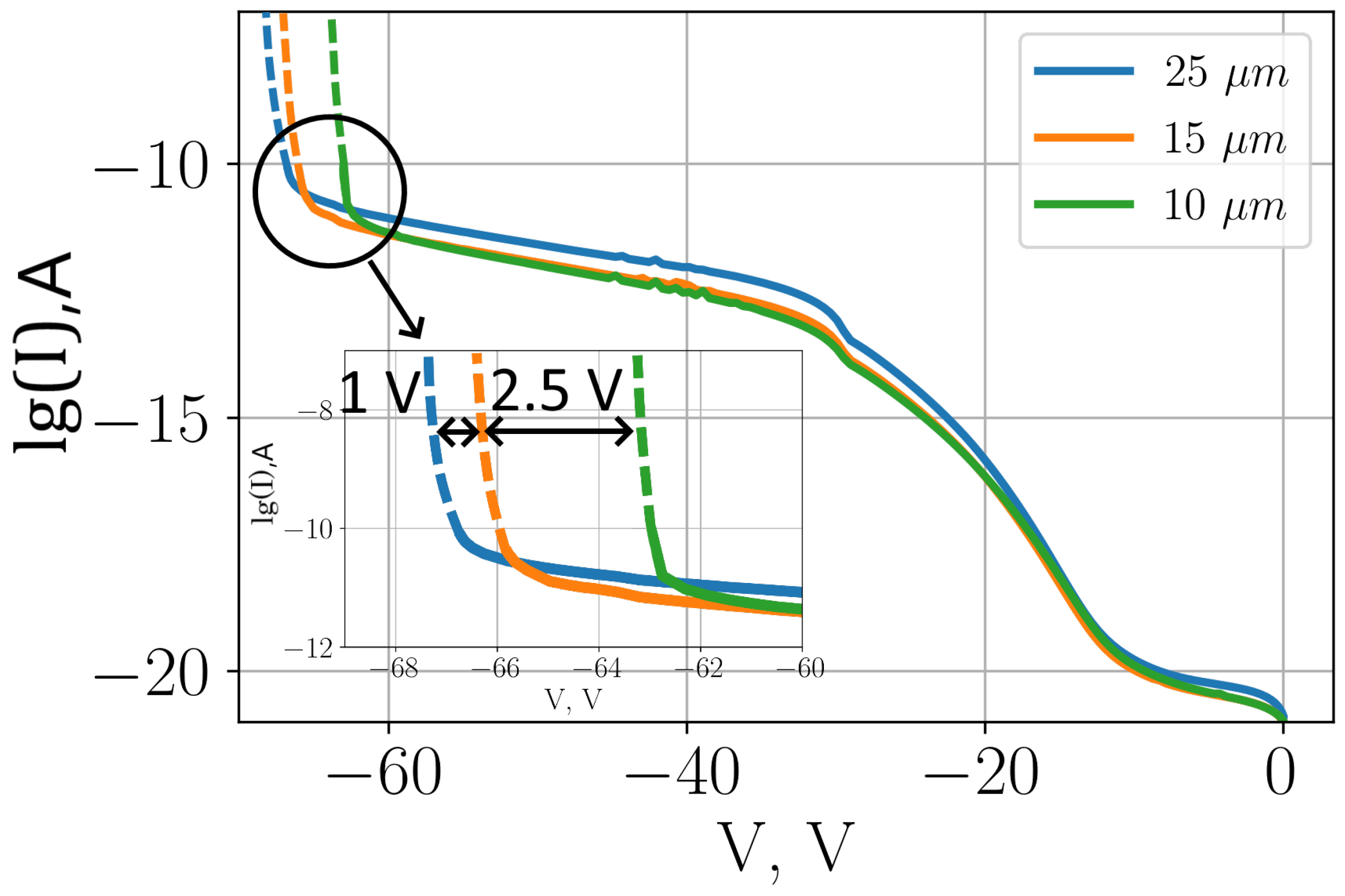 As we can see in this figure, devices with a smaller active region diameter have a lower dark current in the linear part of the CVC. However, these devices also have a lower breakdown voltage.