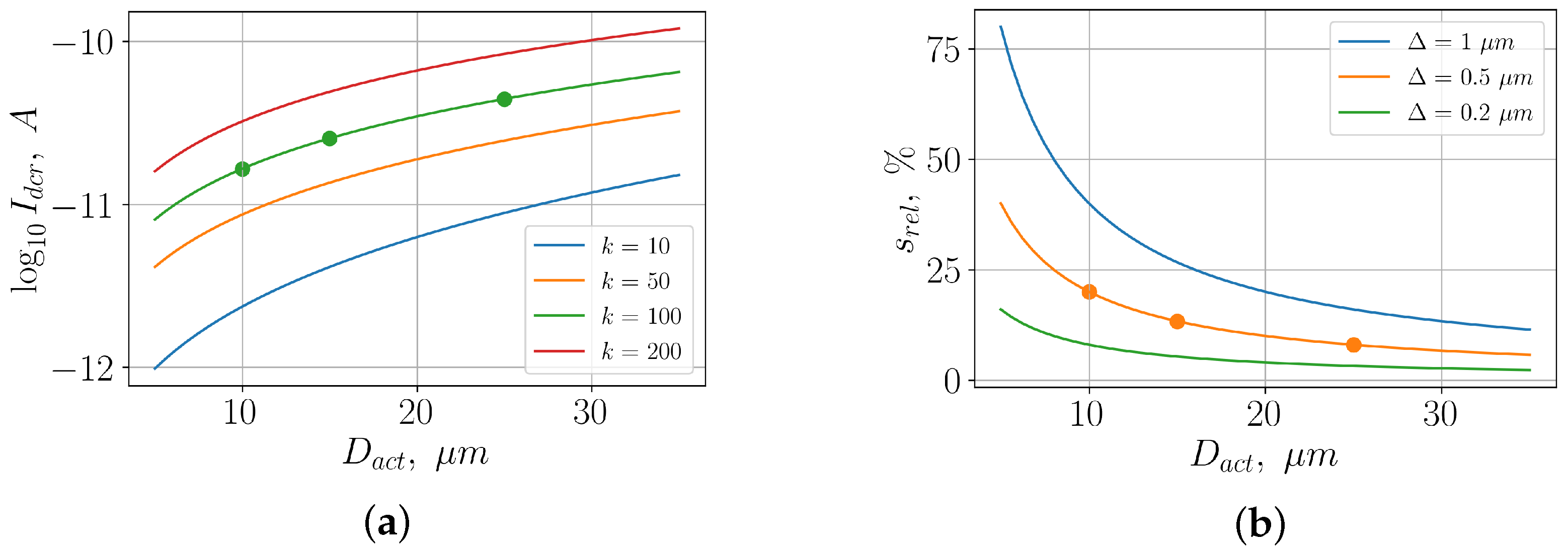 It has been shown that changing the diameter of the active region of the device results in both a change in the dark current in the linear portion of the CVC and a change in the breakdown voltage. It has been shown that decreasing the diameter from m to m reduces the dark current in the linear operation mode of the device by approximately 10 dB. However, it results in a breakdown voltage decrease by approximately V. The first property leads to a decrease in when the device is operated in the Geiger mode. However, the second property reduces the probability of photon detection.