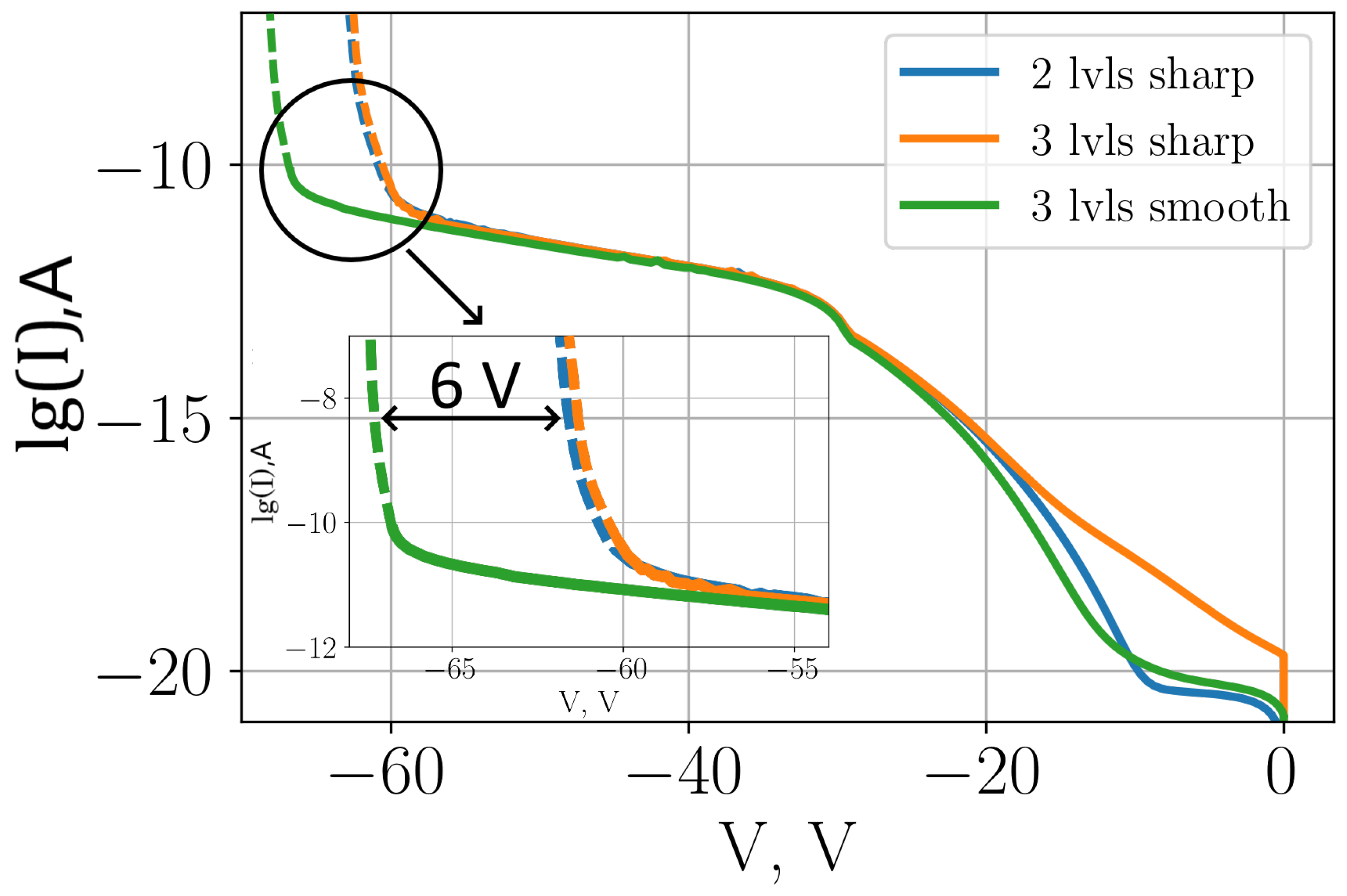 Figure 11 shows the CVCs for different types of structures without incident radiation. The avalanche breakdown for a structure with a three-level multiplication region with sharp transitions occurs about 200 mV earlier than for a structure with a two-level multiplication region with sharp transitions. The avalanche breakdown voltage fully determines the limits of device operation in Geiger and linear modes.