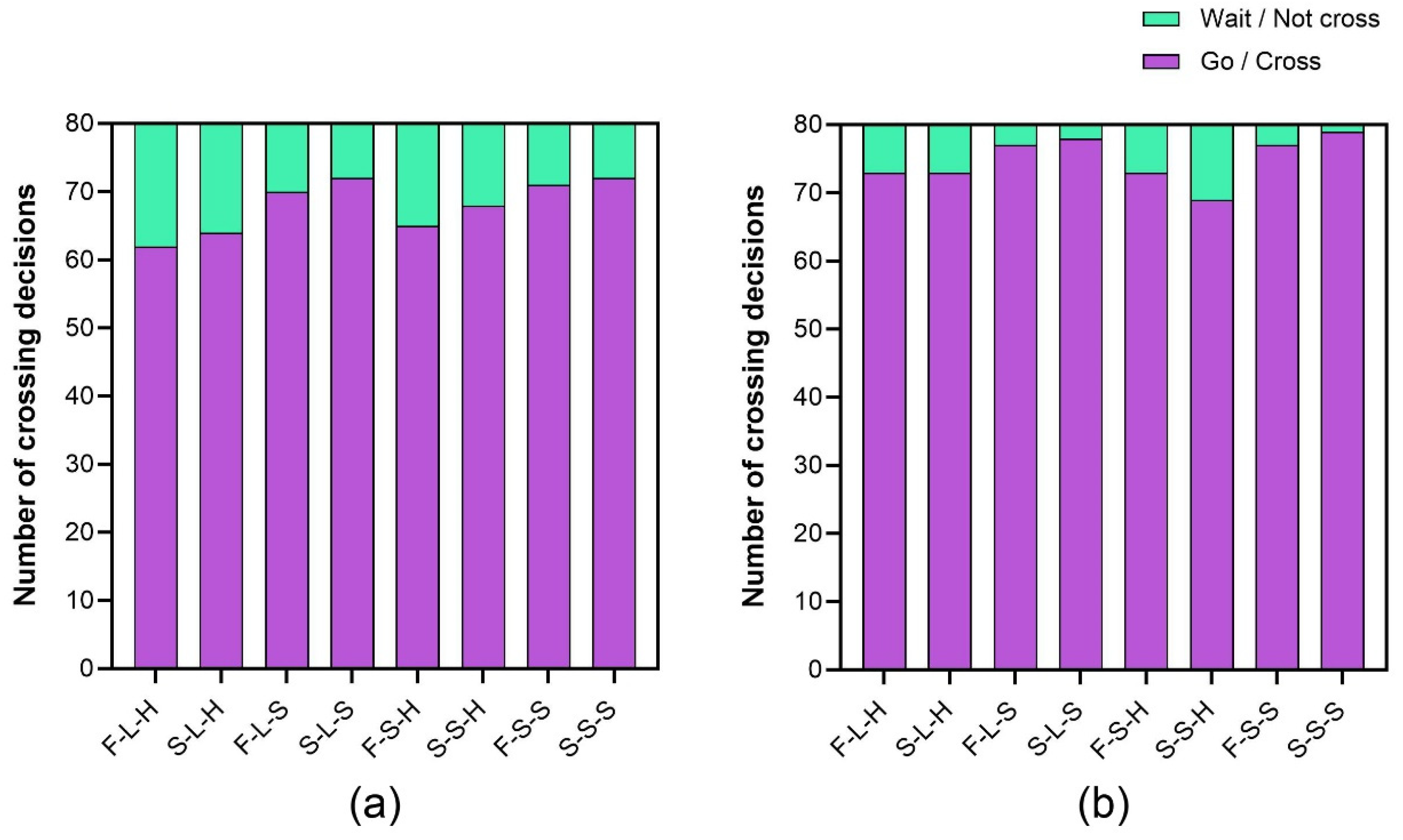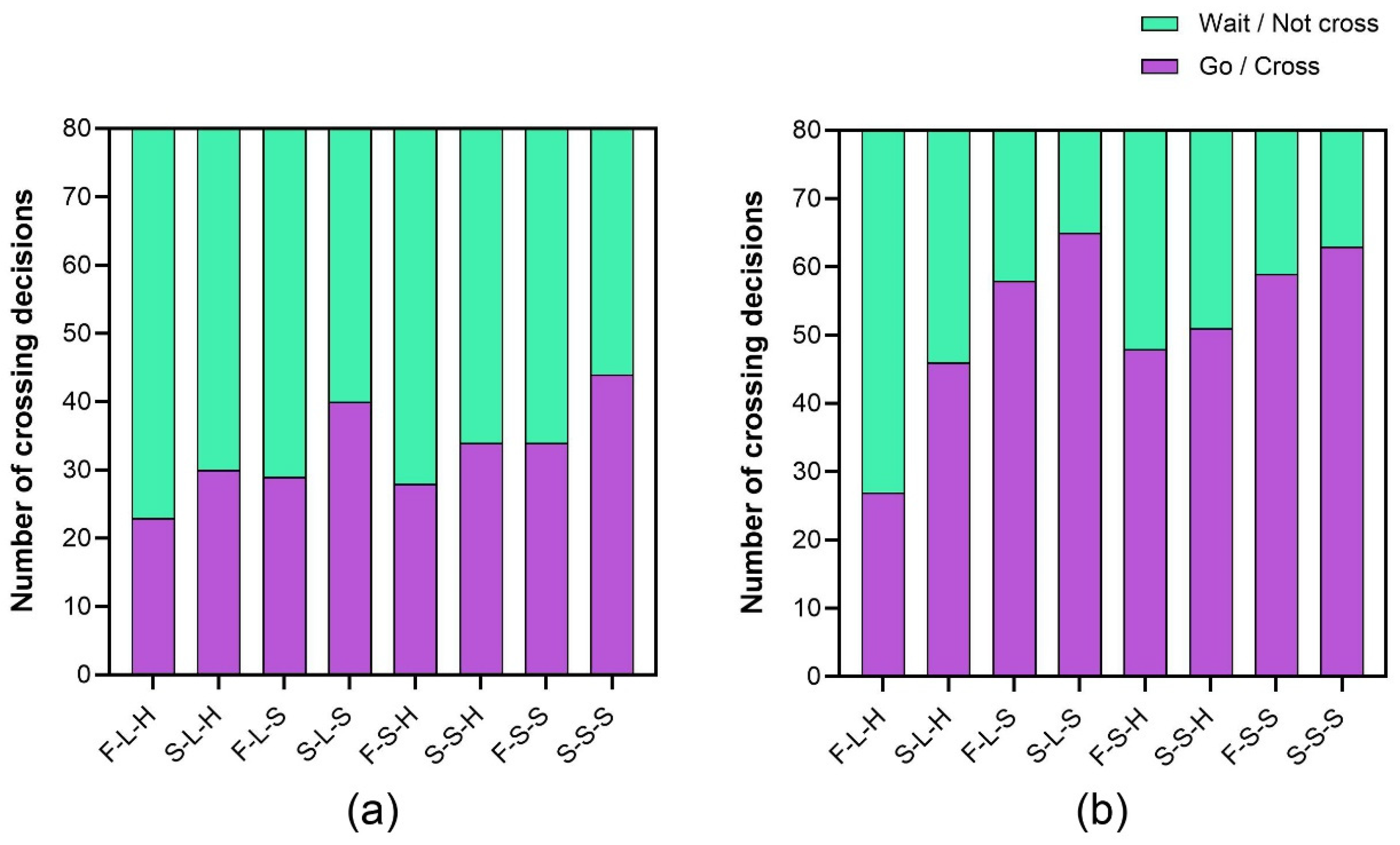 - The influence of dynamic cues is highly context-dependent, with lighting features significantly affecting decisions primarily during constant vehicle motion or longer time gaps, whereas vehicle kinematics dominate during deceleration. The AV should dynamically adapt lighting characteristics to optimize pedestrian safety in mixed traffic.