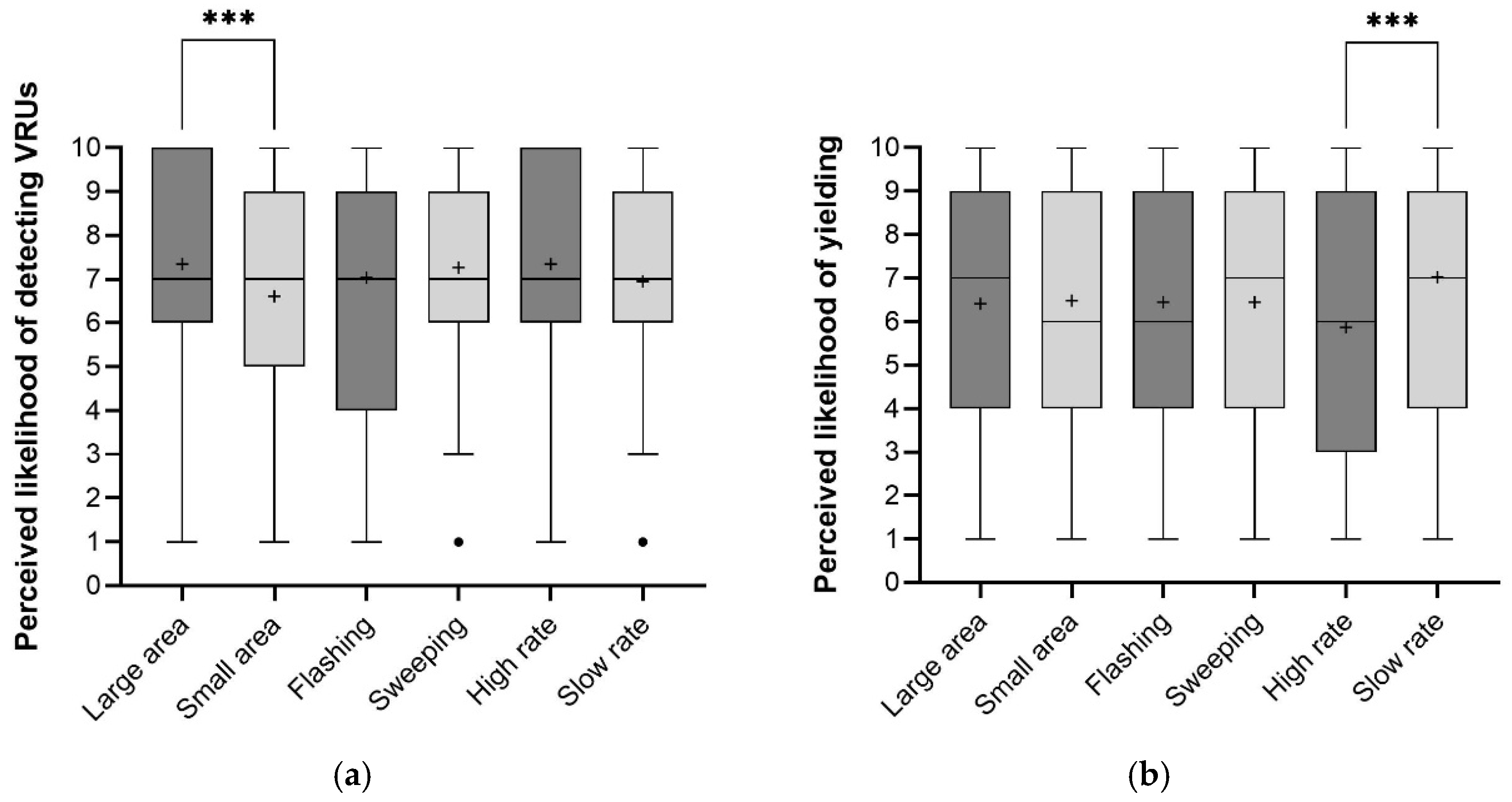 | (a) Participants’ perceived likelihood that the AV detects the VRU and of vehicular yielding | ||||||||||||||||