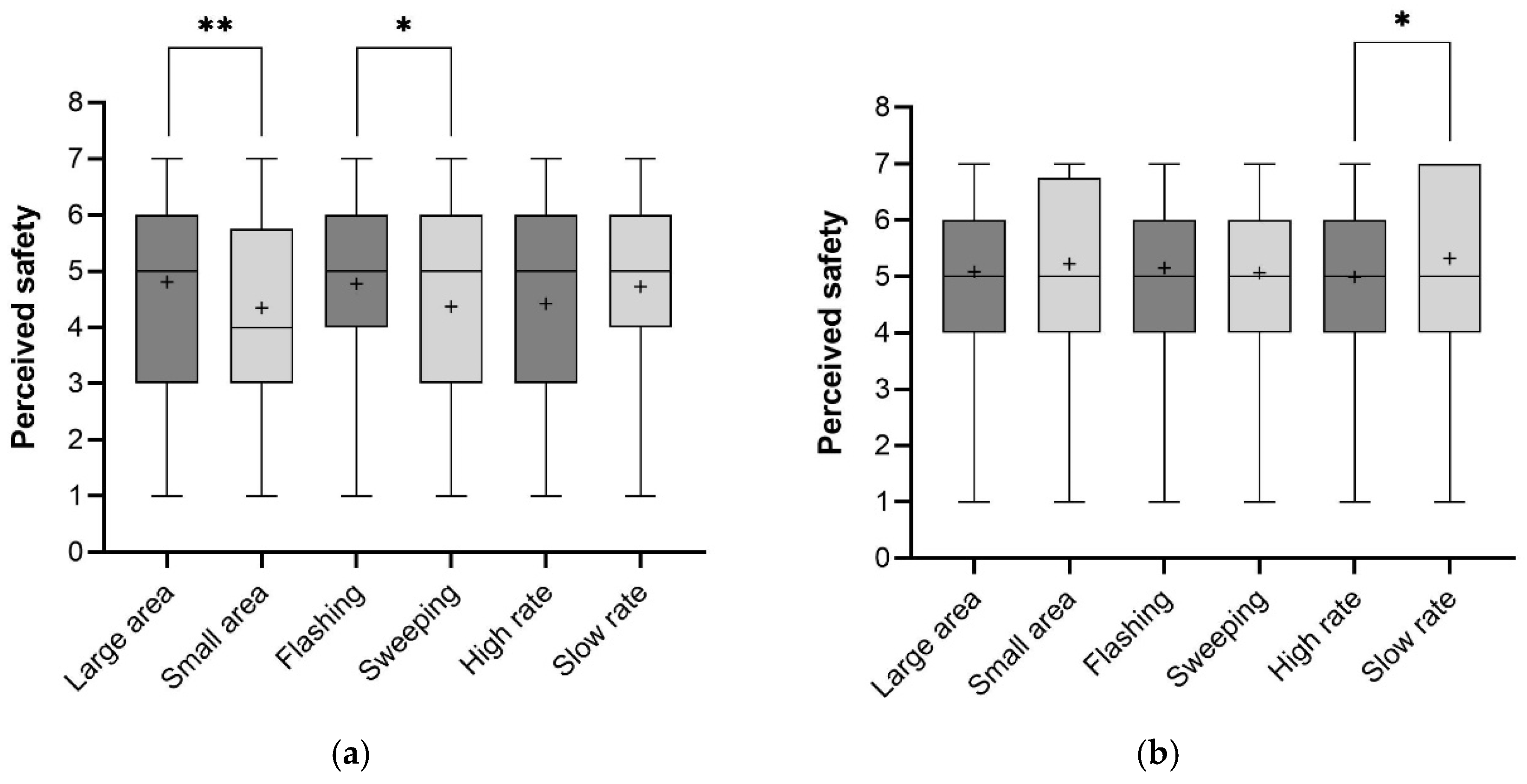 - Dey, D.; Senan, T.; Hengeveld, B. Multi-modal eHMIs: The relative impact of light and sound in AV-pedestrian interaction. In Proceedings of the 2024 CHI Conference on Human Factors in Computing Systems, Honolulu, HI, USA, 11–16 May 2024. [Google Scholar]