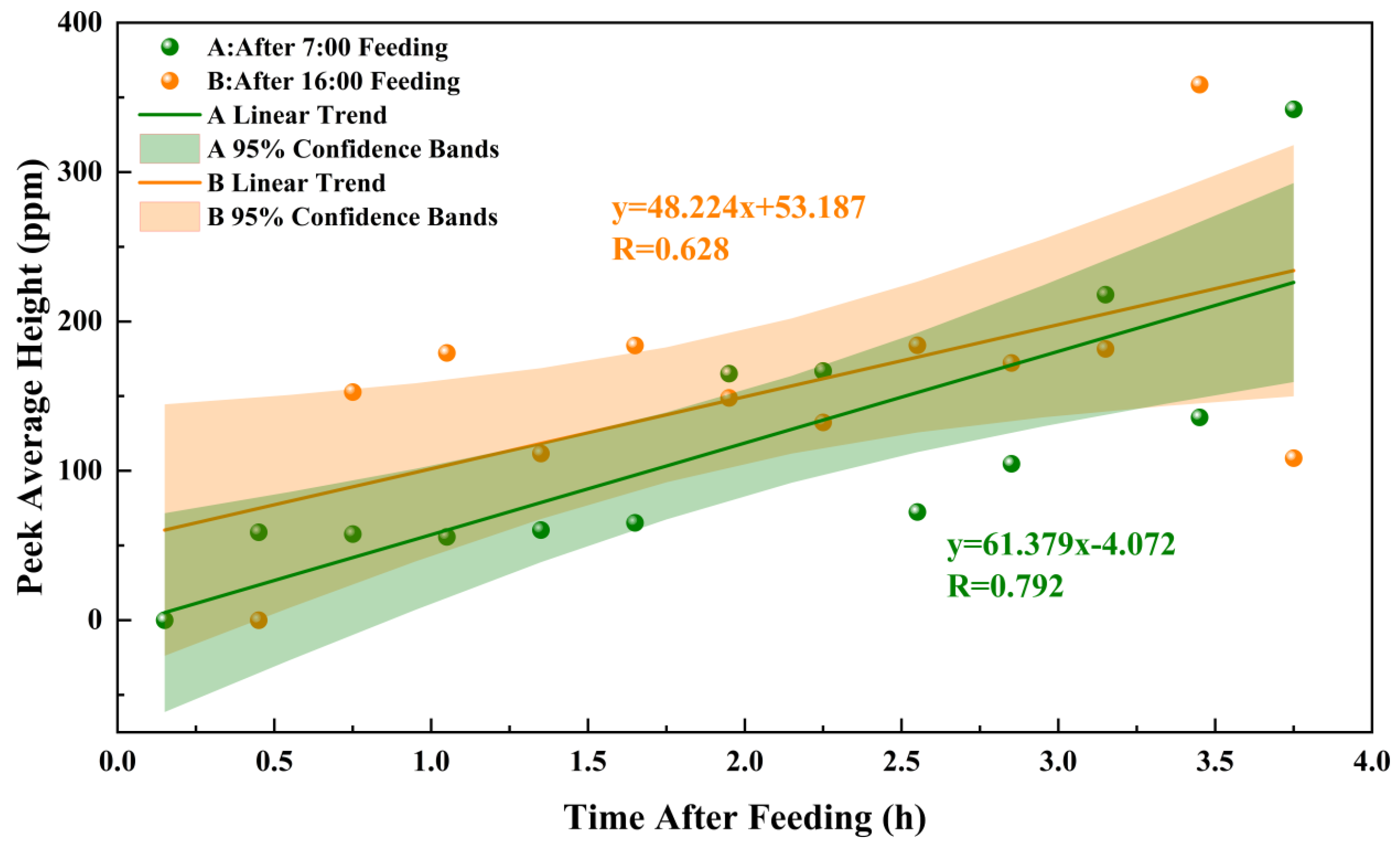- Wang, R.; Cao, Y.R.; Zhang, X.M.; Zhang, F.; Tian, X.; Zhong, R.Z.; Tan, Z.L.; Wang, M. Relationship between daily variations of methane emissions and eructation peaks in dairy cows measured with an automated head-chamber system. Anim. Feed. Sci. Technol. 2023, 303, 115714. [Google Scholar] [CrossRef]