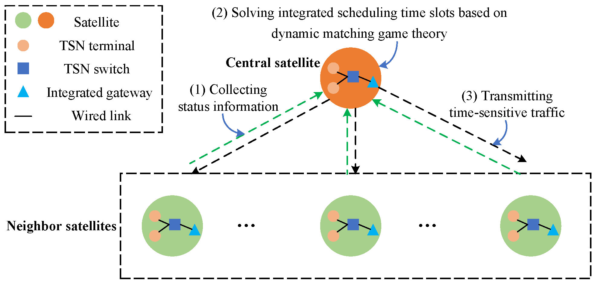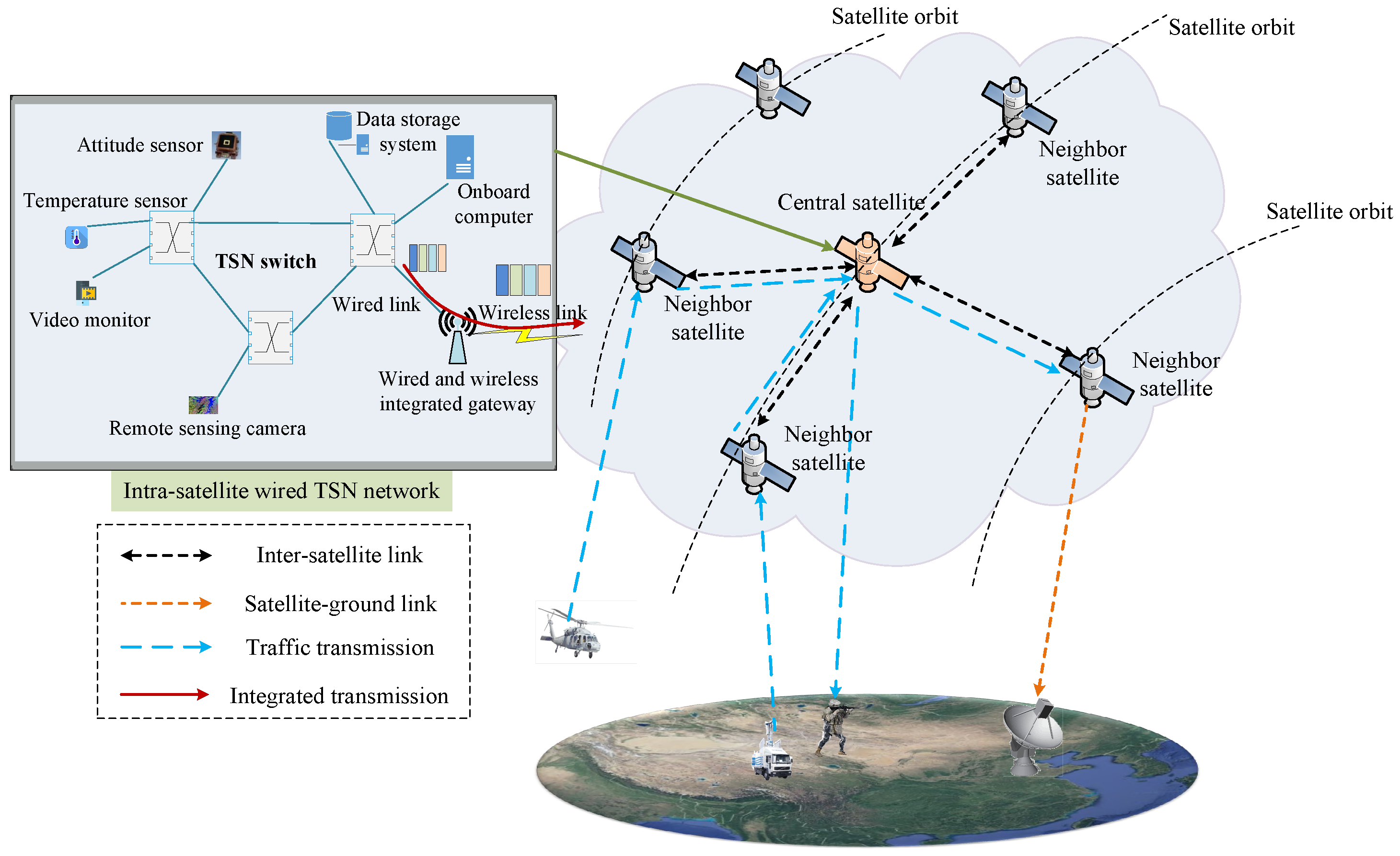 The LEO constellation scenario with wired and wireless integrated scheduling mechanism is shown in