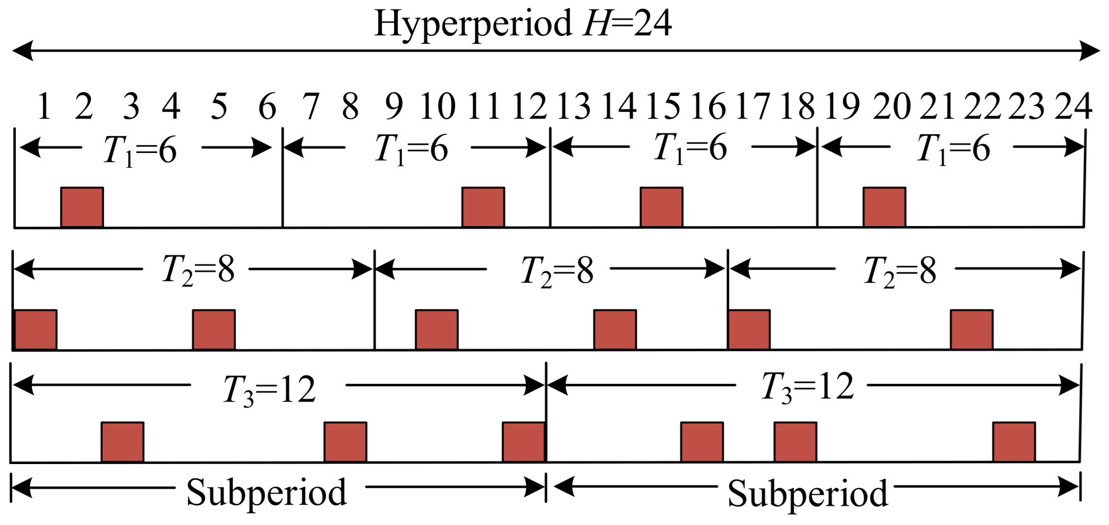 . To facilitate effective scheduling, we introduce the concepts of hyperperiod and subperiod, as illustrated in