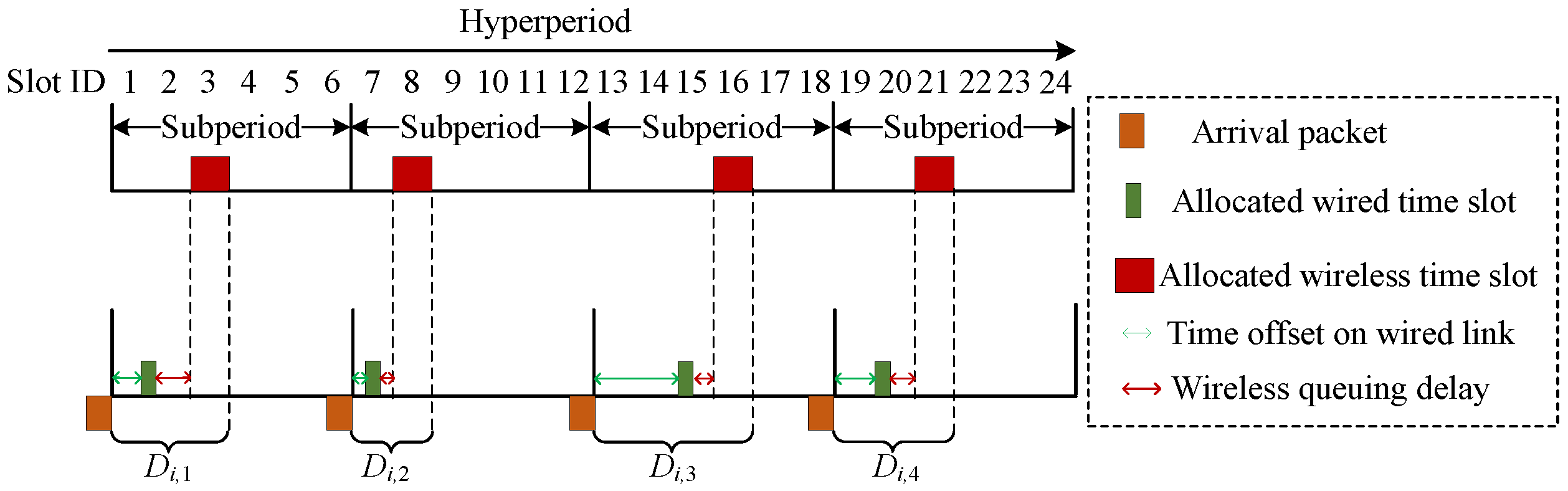 Figure 3 represent time slots occupied by time-sensitive traffic. The subperiod is designed to reduce the solution search space, while the hyperperiod is designed to avoid repetitive solution computation. The scheduling mechanism segments continuous time into multiple uniformly-sized time slots. The durations of wired time slots and wireless time slots are represented by
