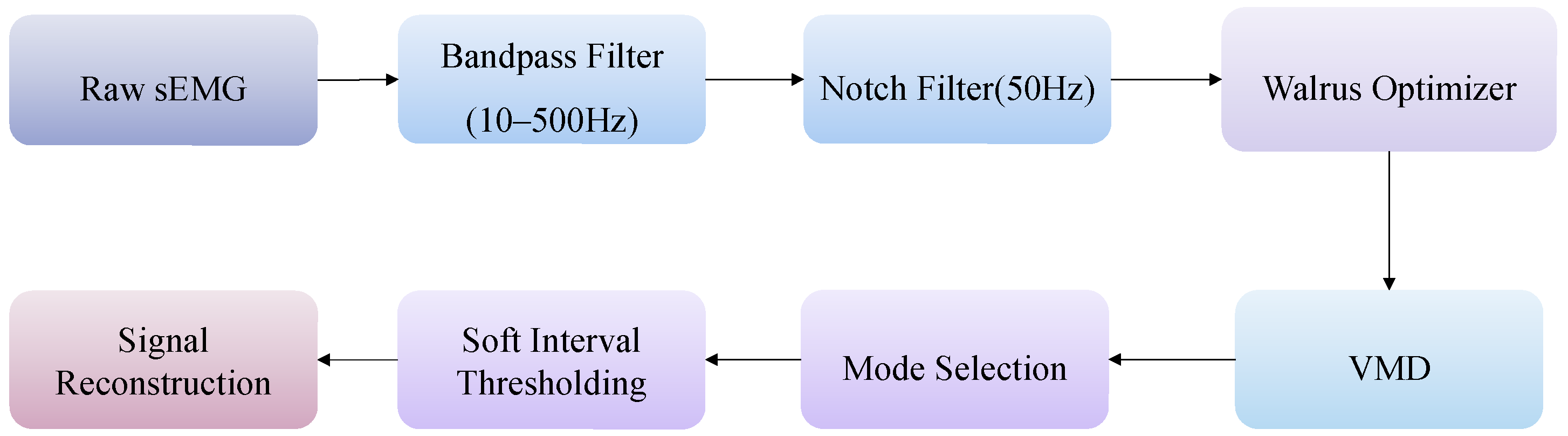 Figure 1. The sEMG processing workflow used in this study is described below. Raw sEMG signals were preprocessed using a fourth-order Butterworth bandpass filter (10–500 Hz) and a 50 Hz notch filter to suppress PLI. The preprocessed signals were then fed into WO–VMD, and VMD was performed with the optimal parameter set. The resulting modes were selected, and the selected modes were processed using soft interval thresholding with an improved threshold estimation formula. Finally, the denoised selected modes were summed to reconstruct the denoised sEMG signal.