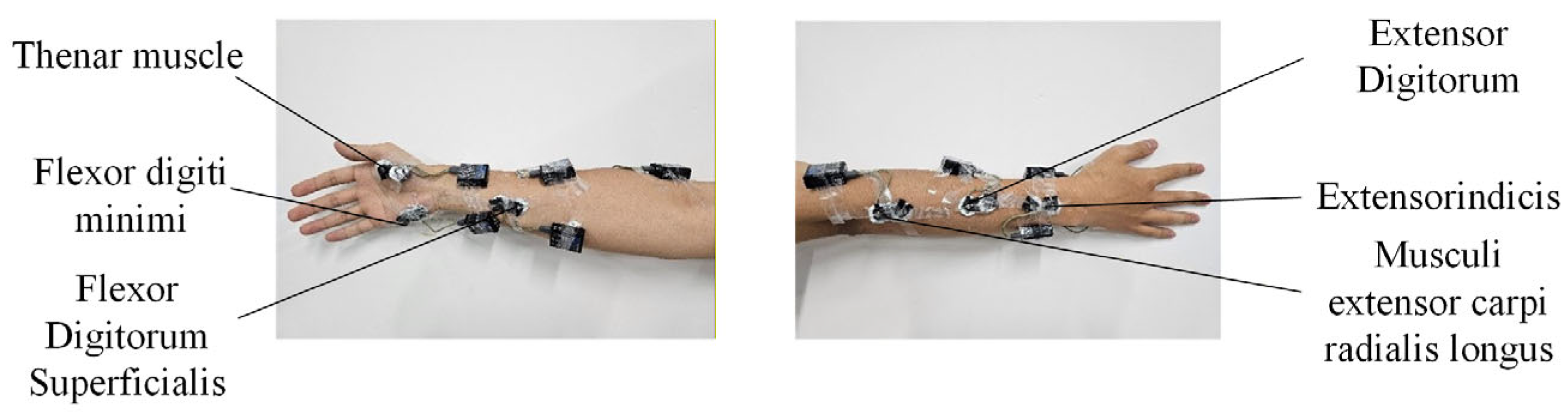 33]. The sensors were manufactured by Noraxon, and the signals were sampled at a rate of 1500 Hz. Specific sensor locations on the right forearm are shown in