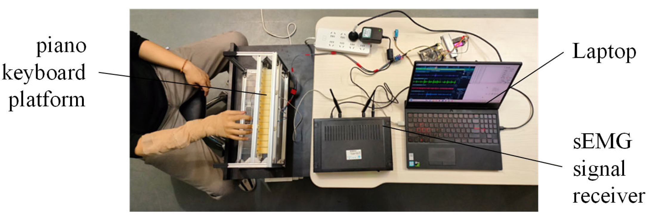 During the experiment, a continuous keystroke task was performed on a mock piano-keyboard platform at 60 beats per minute (BPM). At the beginning of each trial, participants were instructed to remain relaxed for 5 s before performing the keystroke task. This pre-task interval was recorded as a resting segment and was later used for noise-level estimation in the proposed thresholding scheme. Each participant completed ten trials, with 20 keystrokes per trial. Adequate rest was provided between trials to reduce fatigue-related effects on signal quality and task performance. The experimental setup is shown in