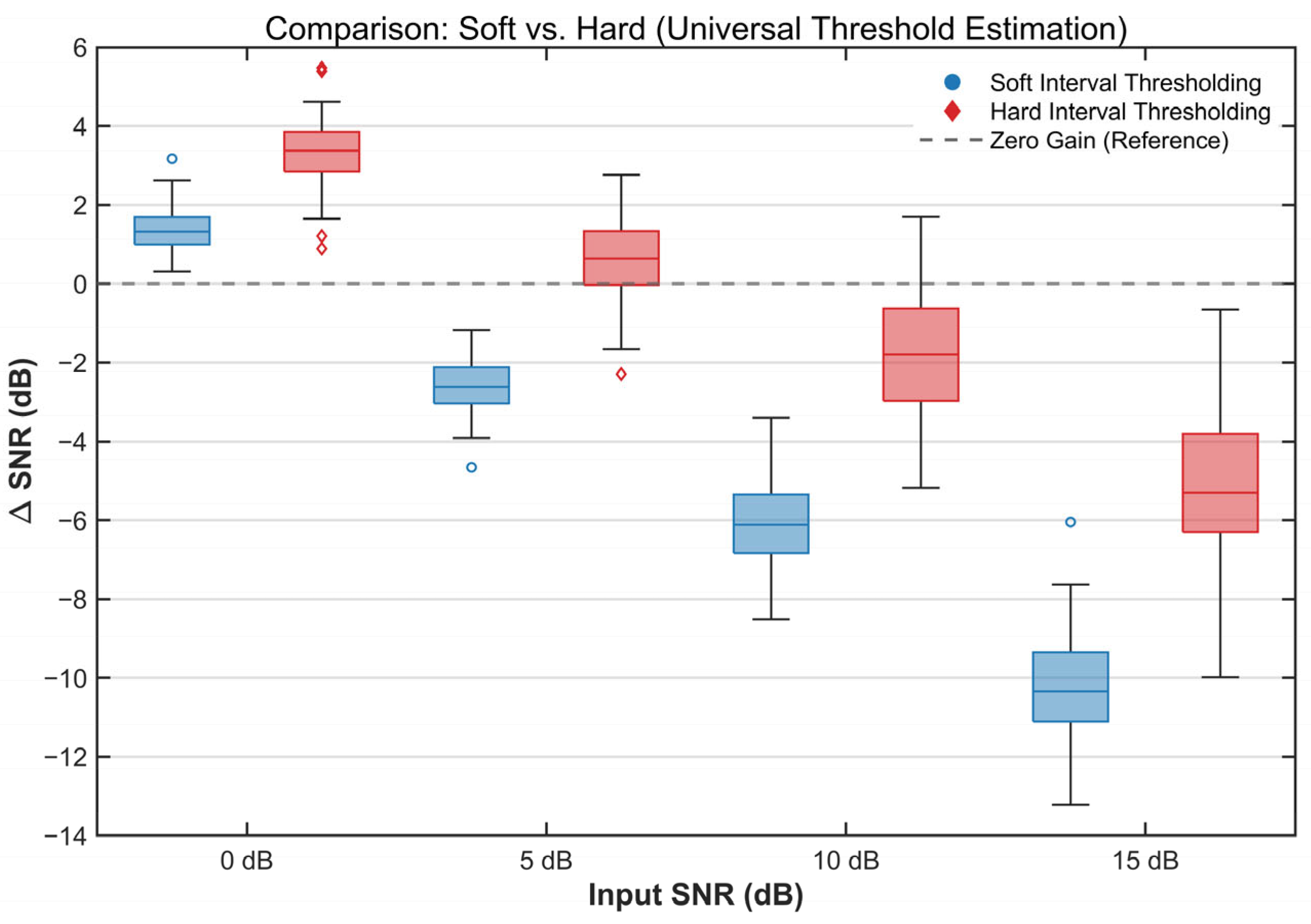 Denoising performance was systematically evaluated by adding noise to the signals at four input SNR levels: 0, 5, 10, and 15 dB.