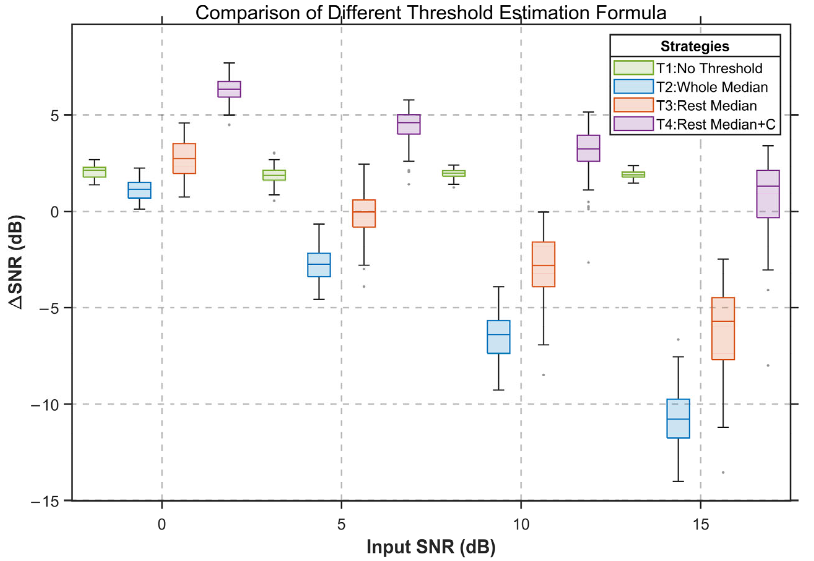 In T4, introducing the coefficient C reduces the threshold magnitude and effectively mitigates the excessive shrinkage induced by soft thresholding, allowing valid sEMG components to be preserved to a greater extent. Experimental results show that T4 achieves a better performance, with particularly strong improvements at low input SNR. For example, when the input SNR is 5 dB, T4 improves the ΔSNR by approximately 7 dB relative to T2, demonstrating the advantage of the proposed thresholding strategy under severe noise conditions.