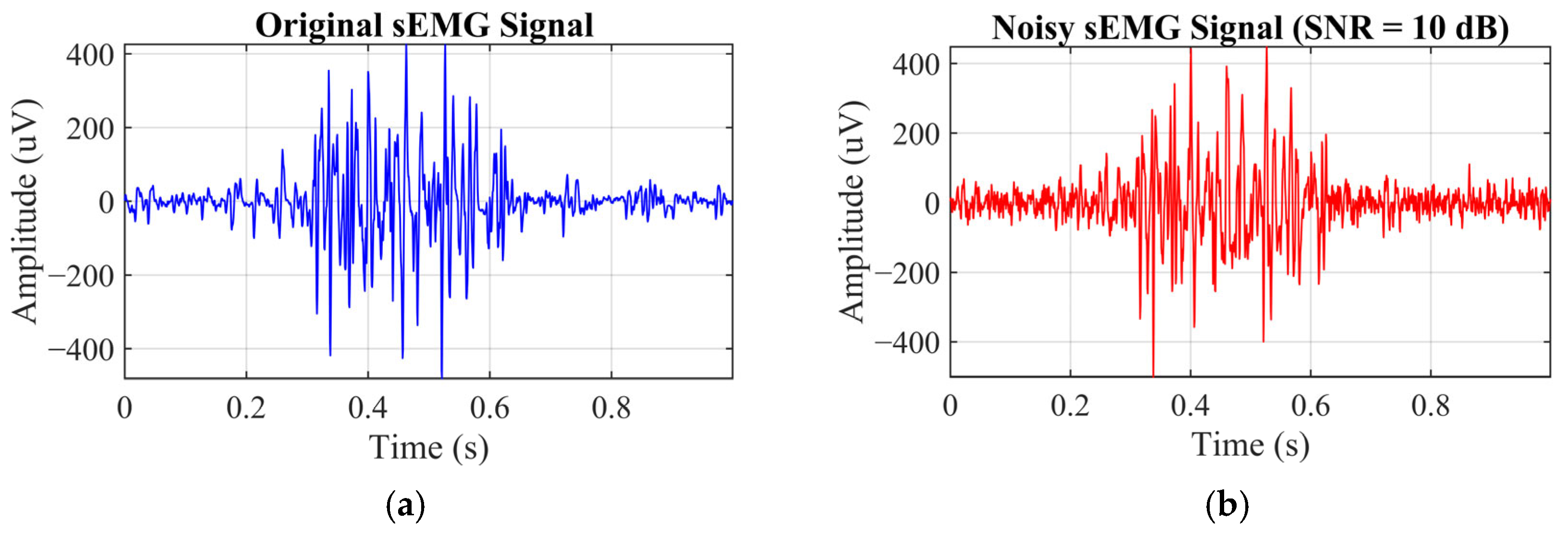 Figure 7 presents an example sEMG segment from a single index-finger keystroke, including the original signal and the signal contaminated at an input SNR of 10 dB.
