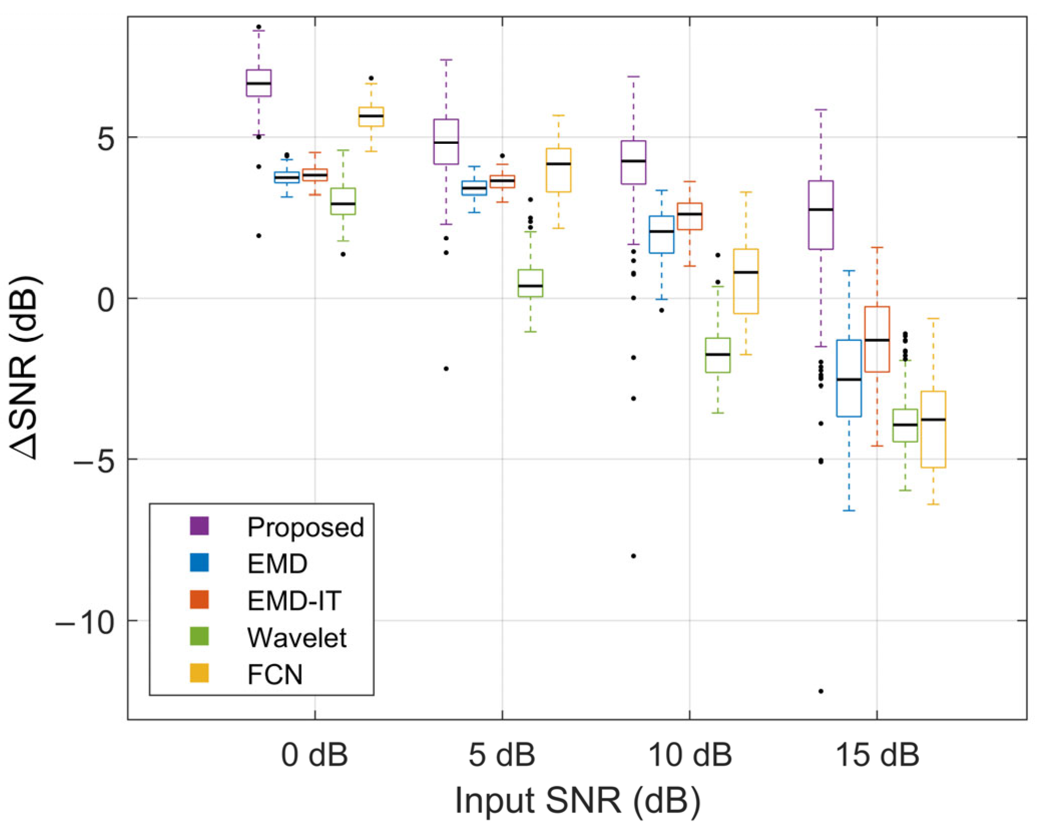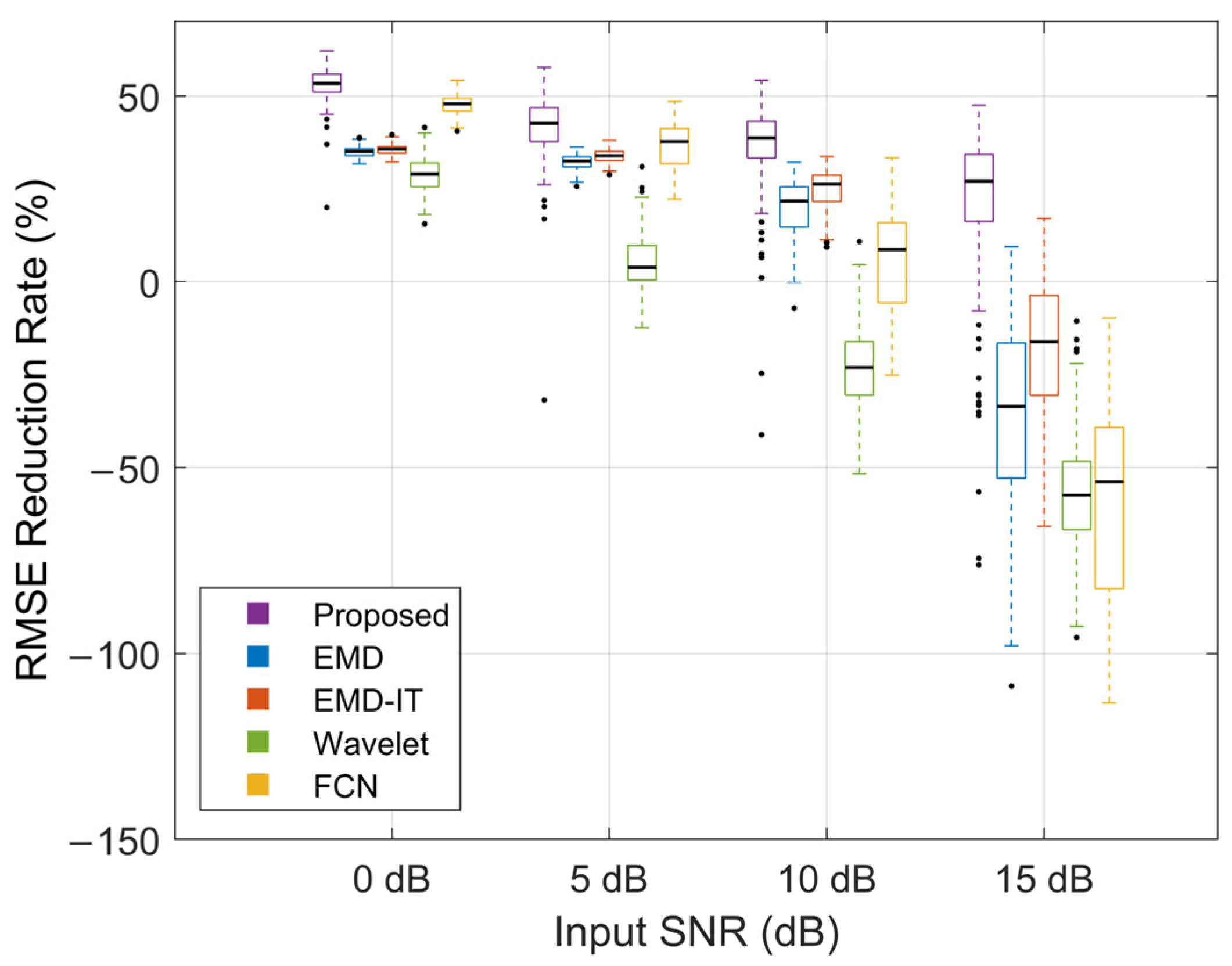Figure 10, the metric medians decreased as the input SNR increased, indicating less room for improvement under light-noise conditions. Across all noise levels, the proposed method achieved higher ΔSNR and ΔRMSE% than the other methods. Specifically, at input SNR levels of 0, 5, 10, and 15 dB, the proposed method achieved median ΔSNR values of 6.65, 4.82, 4.24, and 2.75 dB and median ΔRMSE% values of 53.38%, 42.62%, 38.68%, and 27.03%, respectively. At 15 dB, the distributions of both metrics remained positive, indicating a net gain even at a high input SNR. Under heavy-noise conditions, the proposed method exhibited more compact boxplots, suggesting more stable improvements and robust performance. Under light-noise conditions, more extreme outliers were observed for the proposed method. Such outliers may reflect occasional failures caused by over-attenuation at a small number of boundary samples. In addition, a smaller denominator in the RMSE-reduction ratio under this condition can amplify outliers, leading to more pronounced extreme values. At input SNRs of 0 dB and 5 dB, FCN outperformed EMD and EMD-IT. The opposite trend was observed at 10 dB and 15 dB, suggesting that FCN is better suited to heavy-noise scenarios. At 15 dB, all baseline methods exhibited marked performance degradation, suggesting that informative sEMG components may have been misclassified as noise and attenuated.