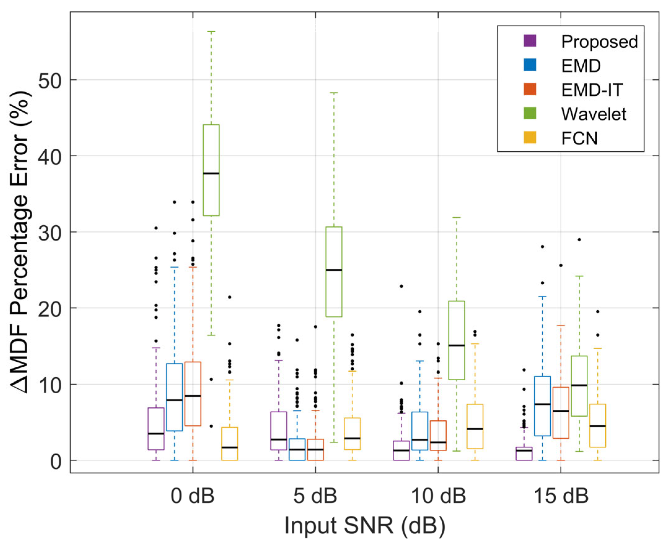 Figure 11 indicates that the proposed method consistently yields low ΔMDF% errors. At input SNRs of 10 dB and 15 dB, the error remains low with a relatively stable distribution, indicating that effective denoising is achieved while the spectral structure of the signal is well preserved. Low ΔMDF% errors were also observed for FCN across noise levels, indicating good fidelity of physiological features after denoising. For the wavelet-based method, ΔMDF% was higher and the interquartile range (IQR) was wider at input SNRs of 0–10 dB, suggesting the largest perturbation of MDF and poor stability. In contrast, lower MDF errors were observed for EMD and EMD-IT at moderate noise levels. At 15 dB, both the error magnitude and dispersion increased, suggesting that the reconstruction process is more likely to induce spectral shifts under light-noise conditions.