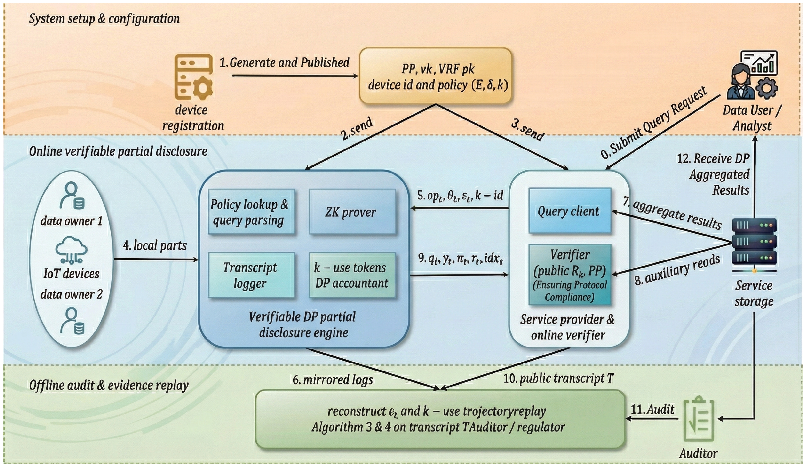 The security goals are fourfold: First, privacy accounting: Under multiple interactions regarding the same record, the system must satisfy the composition bound of -DP, and the process must halt immediately upon budget exhaustion. Second, verifiability: A verifier, without accessing raw values, must be able to check that the current output is indeed computed from the specific commitment via the declared mechanism, that the privacy budget is not overdrawn, and that the invocation count has not exceeded its limit. Third, auditability: Receipts and proofs must be persistant and replayable, eliminating dependencies on historical session states. Fourth, source authenticity: The verifier must be able to confirm in a publicly verifiable manner that the data source participating in the zero-knowledge proof computation is indeed generated by device i holding a legitimate private key and has not been tampered with during transmission.