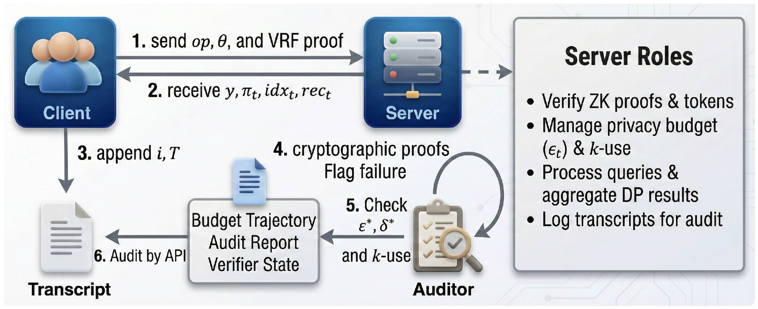 We present a unified system model and verification relation that encodes mechanism consistency and budget limits, enabling any party to independently audit unauthorized access or budget overdrafts via a publicly verifiable evidence path without accessing raw data.