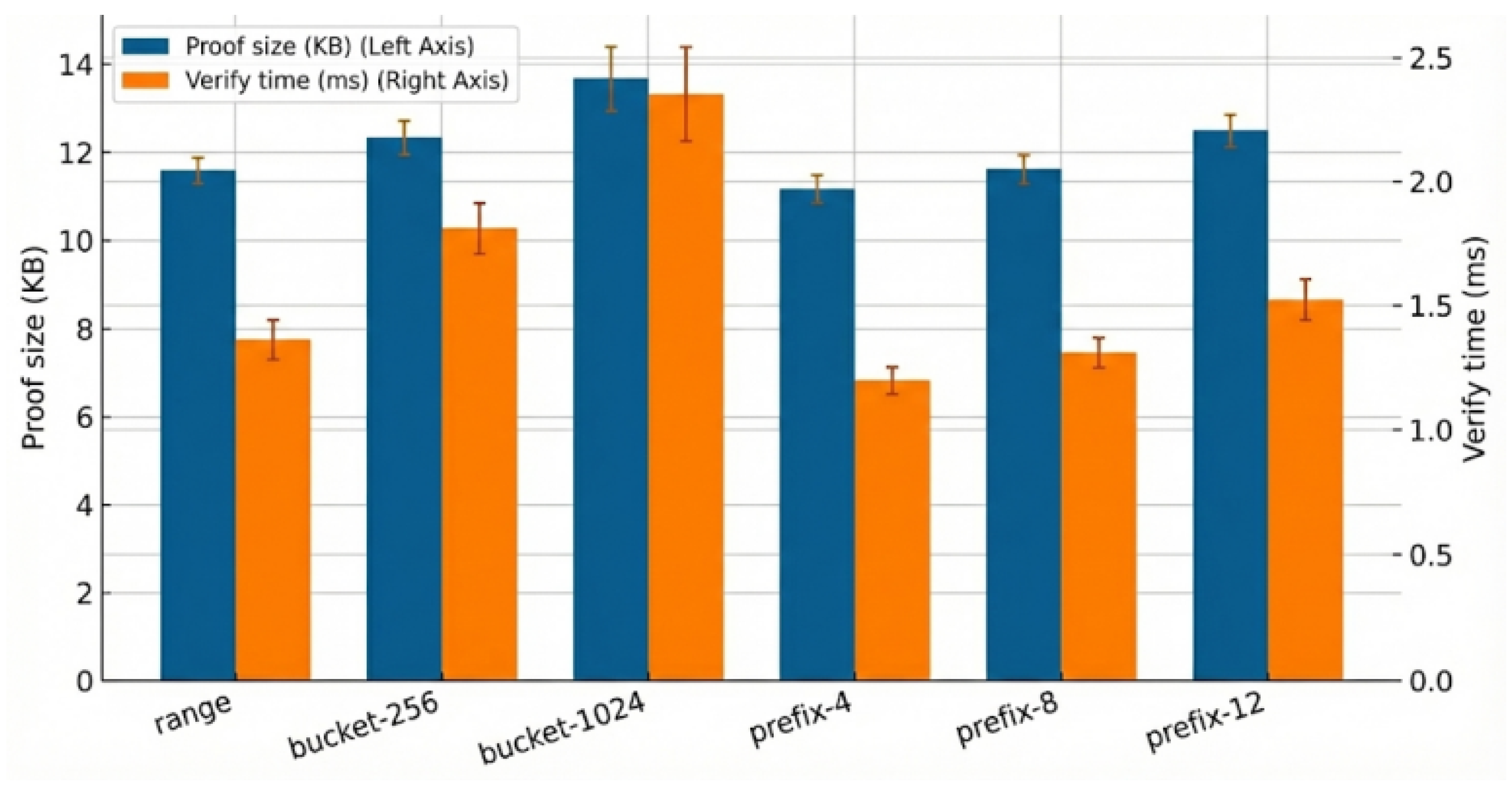 Under end/edge constraints, proof generation and verification overhead are constant-level, mainly determined by the fixed gate count of the chosen proof system, with no linear relationship to input domain size. The p95 end-to-end latency is less sensitive to