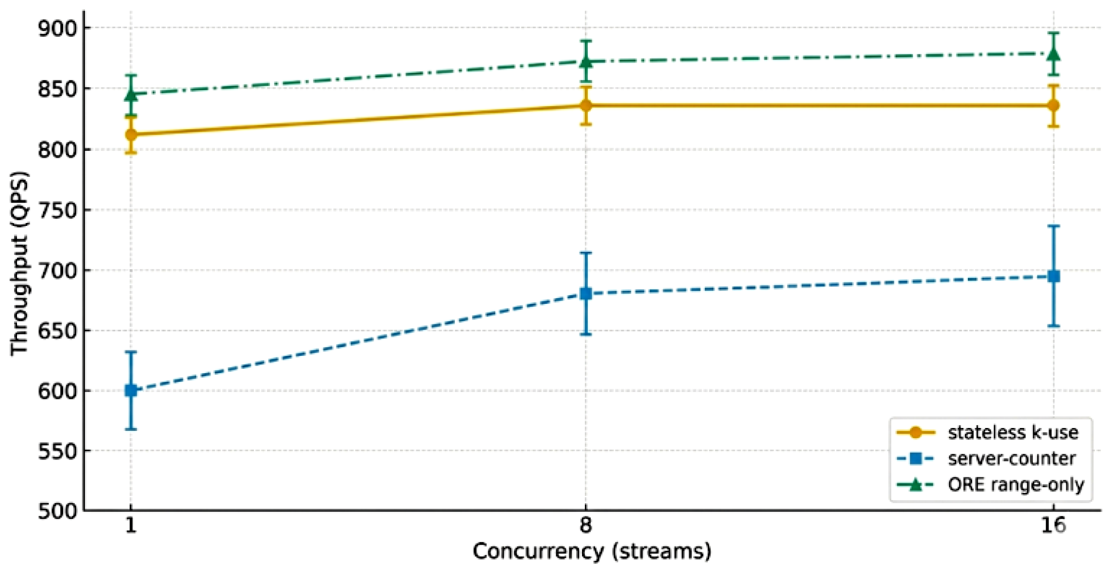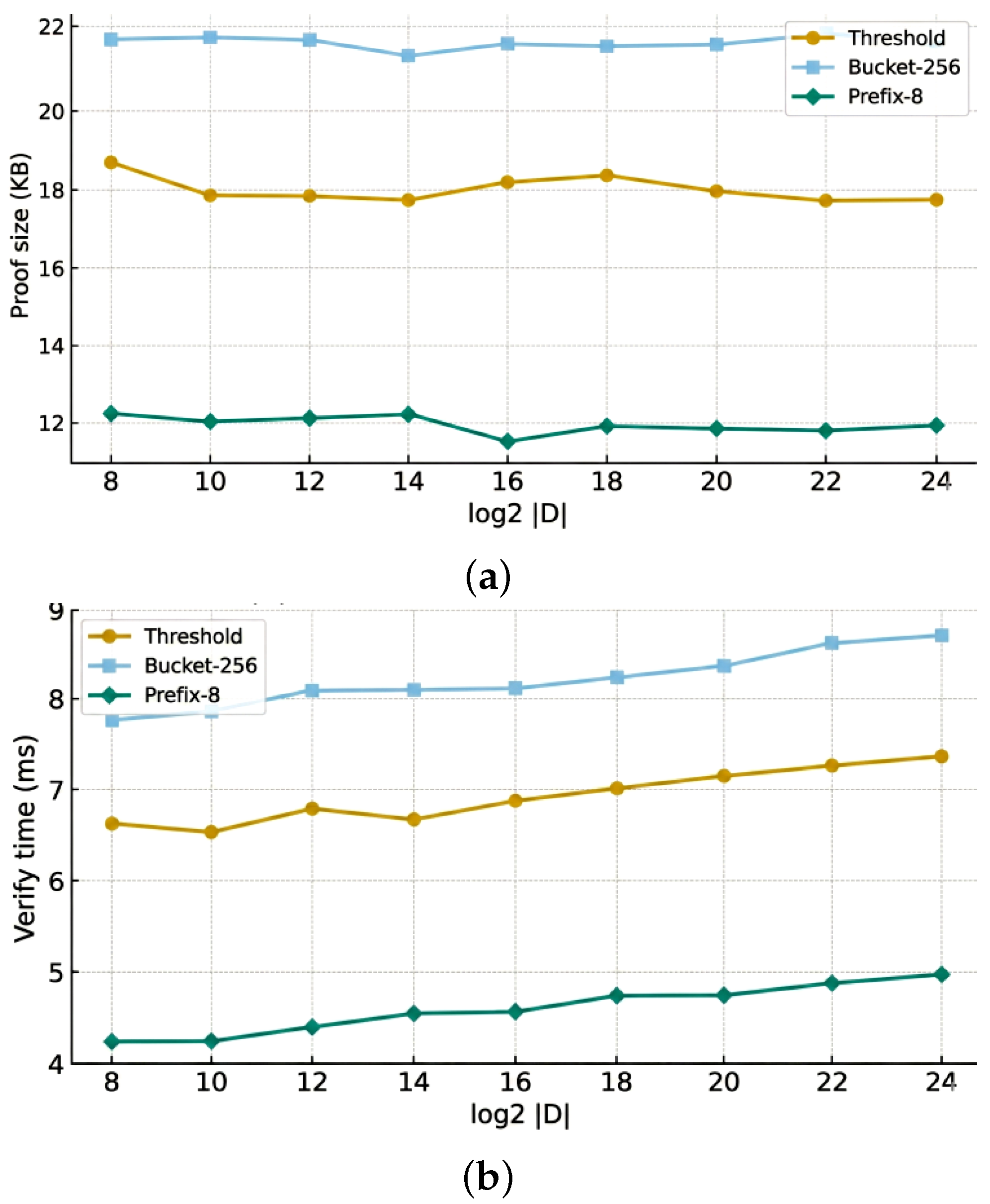 It can be seen that as concurrency increases from 1 to 8 and 16, the throughput improvement of server-counter mode is more significant, while stateless k-use and ORE range-only mainly maintain a more stable high plateau range. Overall, each mode maintains expected scalability as concurrency grows, with no obvious bottlenecks. Additionally, a detailed analysis of proof size and verification time versus domain size is provided in
