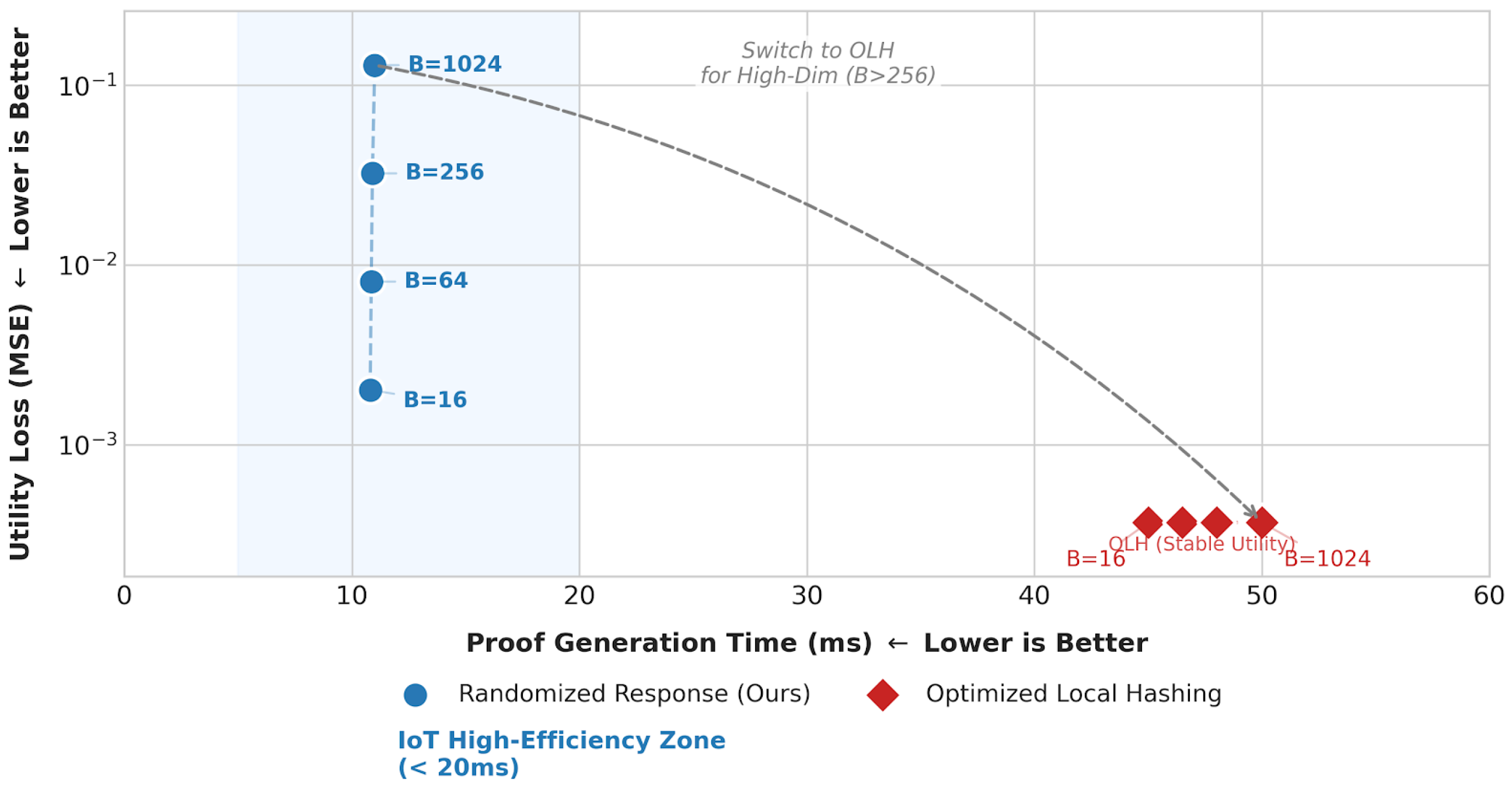 To further validate the rationale for selecting the Randomized Response (RR) mechanism on resource-constrained IoT devices and explore optimization paths for high-dimensional query scenarios, this section conducts a quantitative trade-off analysis between the RR and Optimized Local Hashing (OLH) mechanisms. The experiment sets a privacy budget of , a sample size of , and selects four typical bucket sizes , focusing on two core metrics: The Mean Squared Error (MSE) reflecting data utility and the zero-knowledge proof generation time (Proving Time) reflecting computational overhead.